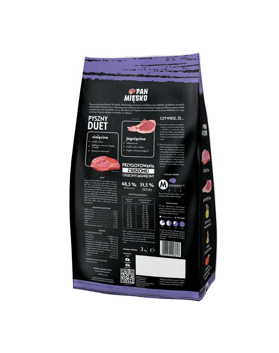 Pán Mäso teľa s jahňacím mäsom je receptúra pripravená na základe špeciálnych potrieb starších psov a seniorov. Obsahuje veku primerané množstvo výživných bielkovín. Znížené množstvo tuku má pozitívny vplyv na fungovanie pečene a slinivky brušnej dospelého organizmu. Prídavok omega - 3 kyselín, glukozamínu a chondroitín sulfátu pomáha podporovať zdravé kĺby a prídavok taurínu pomáha podporovať srdce. V tejto receptúre sme nahradili výživný hrášok ľahko stráviteľnými batátmi a zemiakmi, takže s podporou extraktu z juky mojavskej a prídavkom prebiotík MOS a FOS je krmivo ľahko stráviteľné a pozitívne pôsobí na tráviaci a zažívací systém.