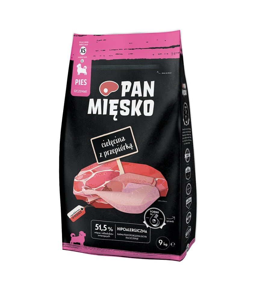 Spoznajte hypoalergénne suché krmivo pre psov Pana Mięsko. Obsahuje starostlivo vybrané mäso s prídavkom šťavnatých, poľských jabĺk, zdravých zelenín a cenných živín, ktoré pozitívne ovplyvnia zdravie a kondíciu vášho psa. Naše recepty sú pripravované odborníkmi, aby zabezpečili vášmu štvornohému spoločníkovi to, čo potrebuje. Váš pes si zaslúži to najlepšie.