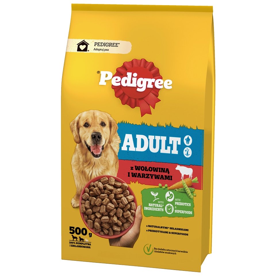 PEDIGREE Adult suché krmivo s hovädzím mäsom a zeleninou je kompletné krmivo pre psy veľkých a stredných plemien. Receptúra, ktorú vyvinuli veterinári a odborníci na výživu z WALTHAM Institute of Animal Science, obsahuje prebiotiká a superpotraviny: mrkvu, ktorá je zdrojom vitamínu A z beta karoténu, a hrášok, ktorý je zdrojom vlákniny a minerálnych látok. Vaše zviera si zaslúži šťastný úsmev, preto je dôležité udržiavať zdravé zuby a ďasná. Krmivo má špeciálne vyvinutú veľkosť a štruktúru granúl, ktoré pomáhajú čistiť zuby vášho psa. Vybrané vitamíny skupiny B a zinok podporujú zdravú kožu a srsť, aby váš pes vyzeral a cítil sa skvele. Vitamín E v zložení má antioxidačné vlastnosti a podporuje prirodzenú obranyschopnosť vášho psa. Krmivo PEDIGREE obsahuje prírodnú vlákninu, prebiotiká a kvalitné bielkoviny na podporu zdravého trávenia, pretože každý pes si zaslúži zdravé bruško.