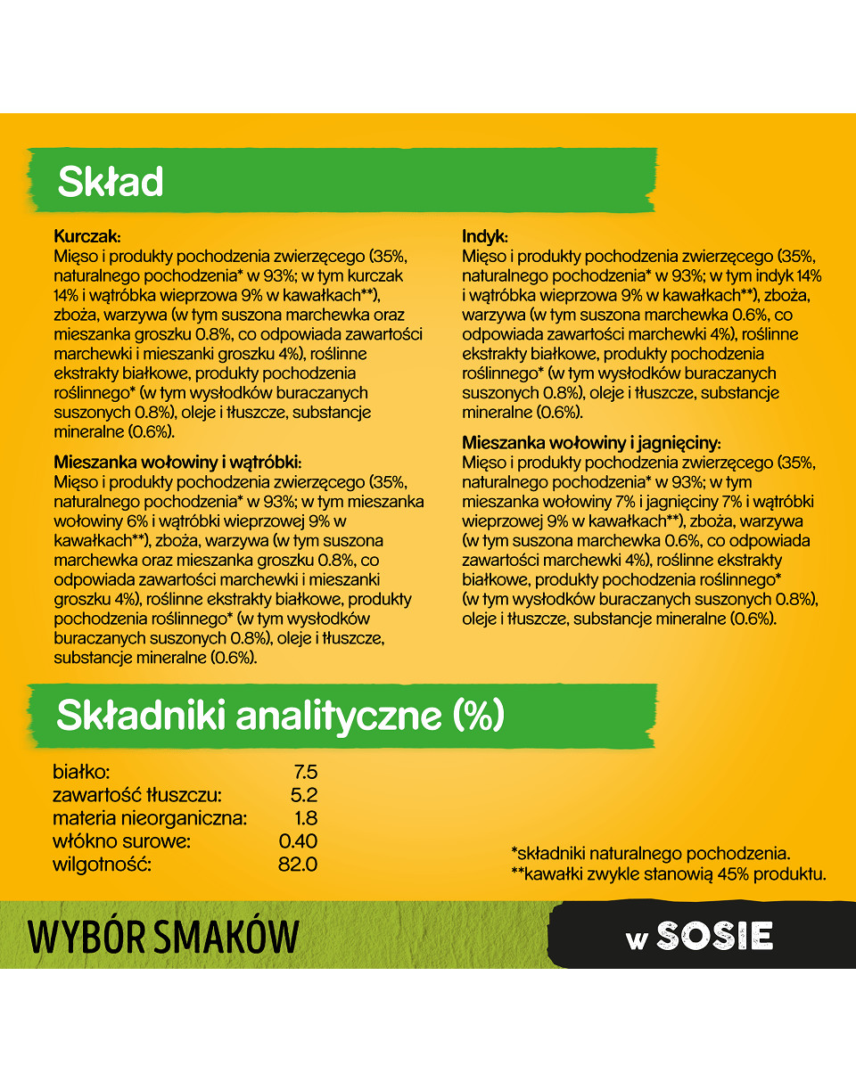 S morčacím a mrkvou: mäso a živočíšne deriváty (39%, vrátane 4% moriakov), obilie, zelenina (vrátane 0,5% sušenej mrkvy, čo zodpovedá 4% mrkvy), rastlinné bielkovinové extrakty, minerály, výrobky pôvodu zelenina (vrátane 0,5% repnej dužiny), oleje a tuky (vrátane 0,5% slnečnicového oleja).