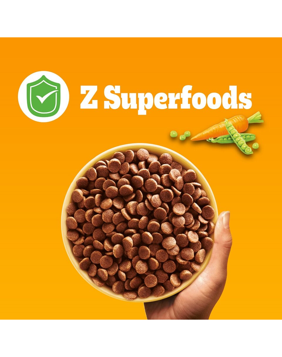 Zloženie: Obilniny, mäso a živočíšne deriváty (vrátane 4% hydiny v hnedých granulách), oleje a tuky (vrátane 0,5% slnečnicového oleja), výrobky rastlinného pôvodu (vrátane 2% repnej dužiny), minerály (1,8 %, vrátane 0,7% tripolyfosforečnanu sodného ako aktívnej zložky v hnedých granulách), zelenina (vrátane 4% mrkvy v oranžových granulách, 4% hrášku v zelených granulách), rastlinné bielkovinové extrakty