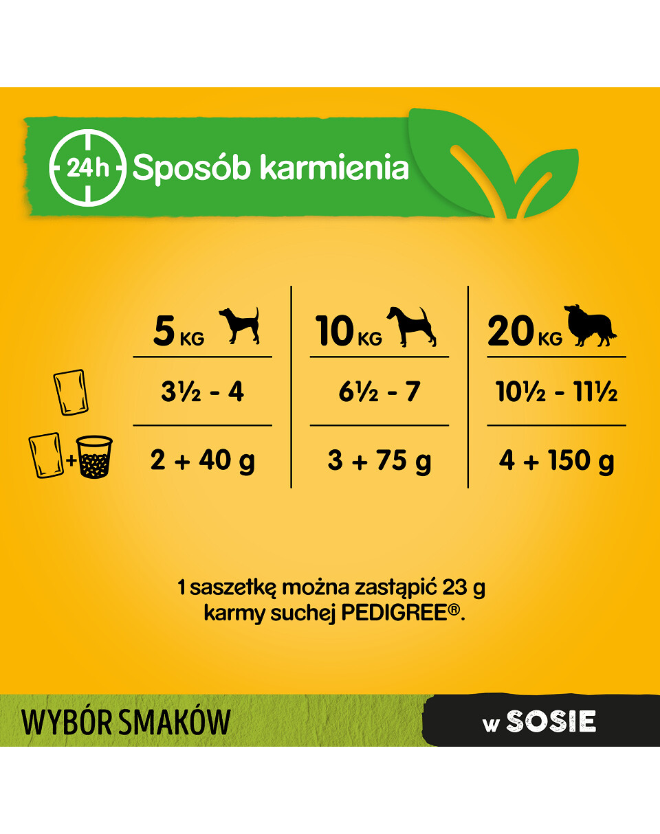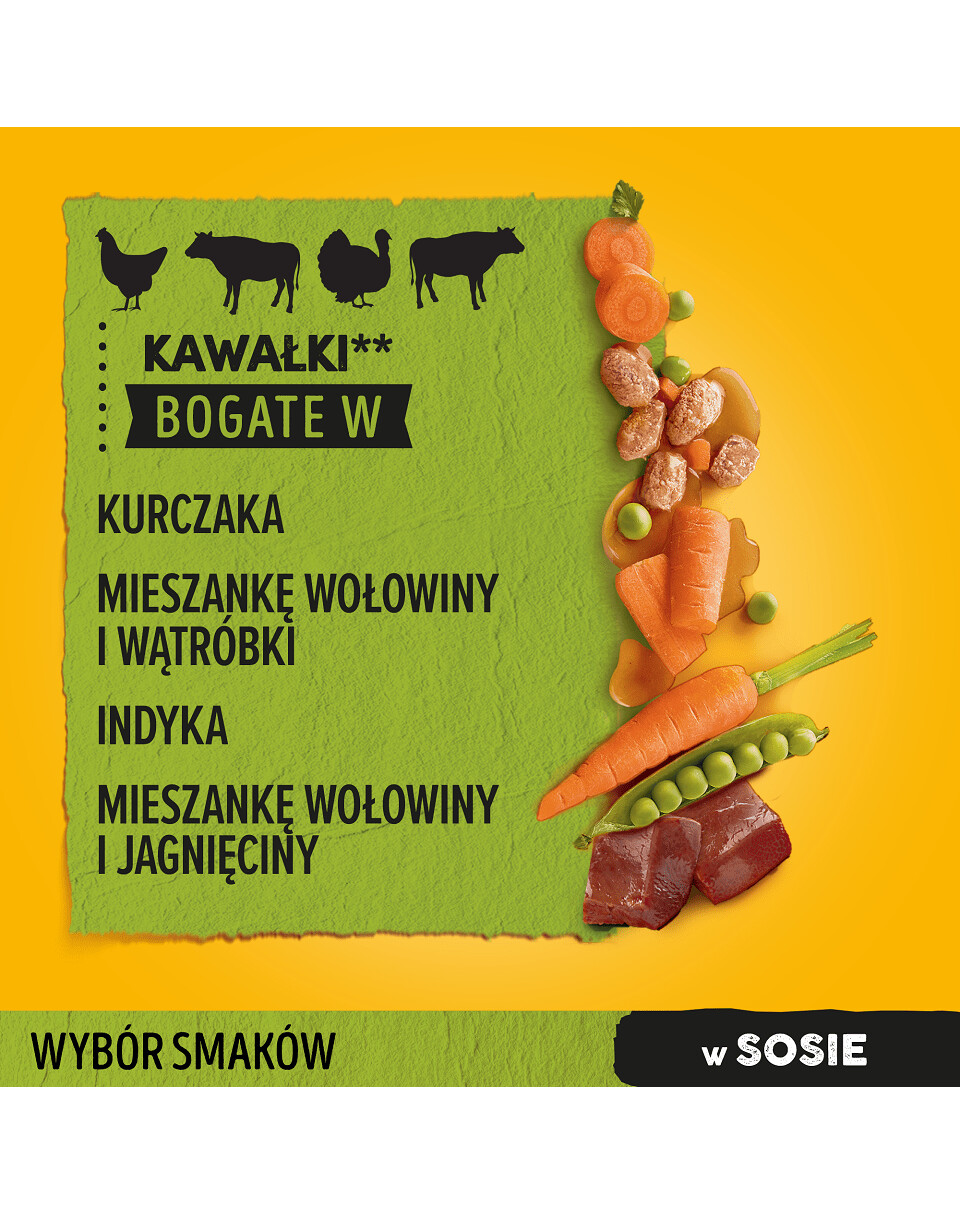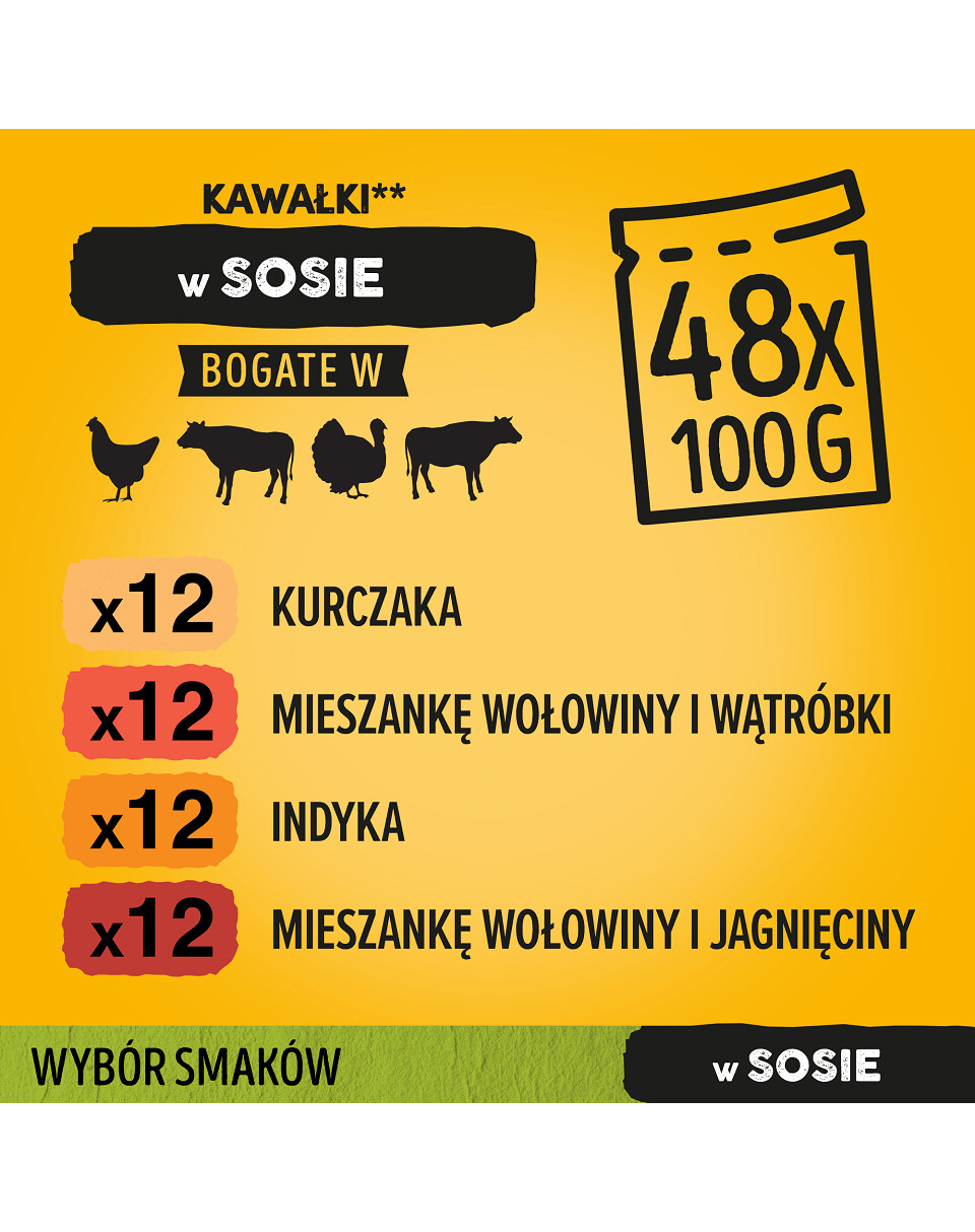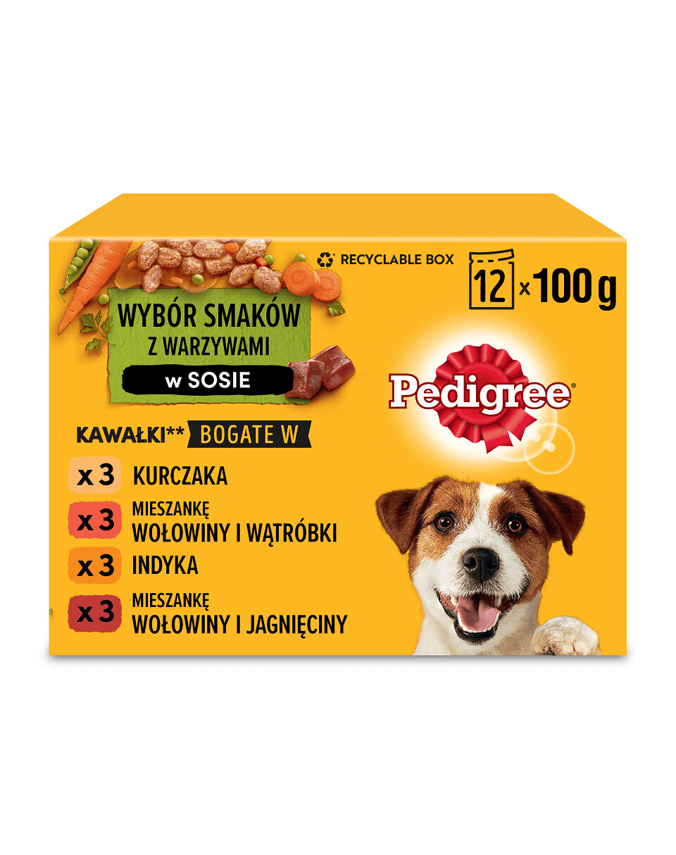 PEDIGREE® Adult Choice of Flavours with Vegetables in Sauce je kompletné krmivo pre dospelé psy vyvinuté veterinármi a odborníkmi na výživu z WALTHAMTM Institute of Animal Science. Vrecúška sa môžu podávať ako samostatné jedlo alebo v kombinácii so suchým krmivom. Mäsové kúsky bohaté na bielkoviny a zaliate v chutnej omáčke uspokoja chute aj toho najnáročnejšieho psa. Špeciálne zloženie bez umelých dochucovadiel a konzervačných látok obsahuje prírodné zložky, vitamíny a minerály. Vitamín E obsiahnutý v krmive podporuje imunitný systém vášho domáceho maznáčika. Vláknina podporuje funkciu čriev pre zdravé trávenie a vďaka zníženému obsahu kalórií* udržíte svojho domáceho miláčika štíhleho. Balenie obsahuje 4 príchute: 3x bohaté kuracie kúsky, 3x bohaté kúsky zmesi hovädzieho mäsa a pečene, 3x bohaté kúsky morčacieho mäsa a 3x bohaté kúsky zmesi hovädzieho mäsa a jahňacieho mäsa.