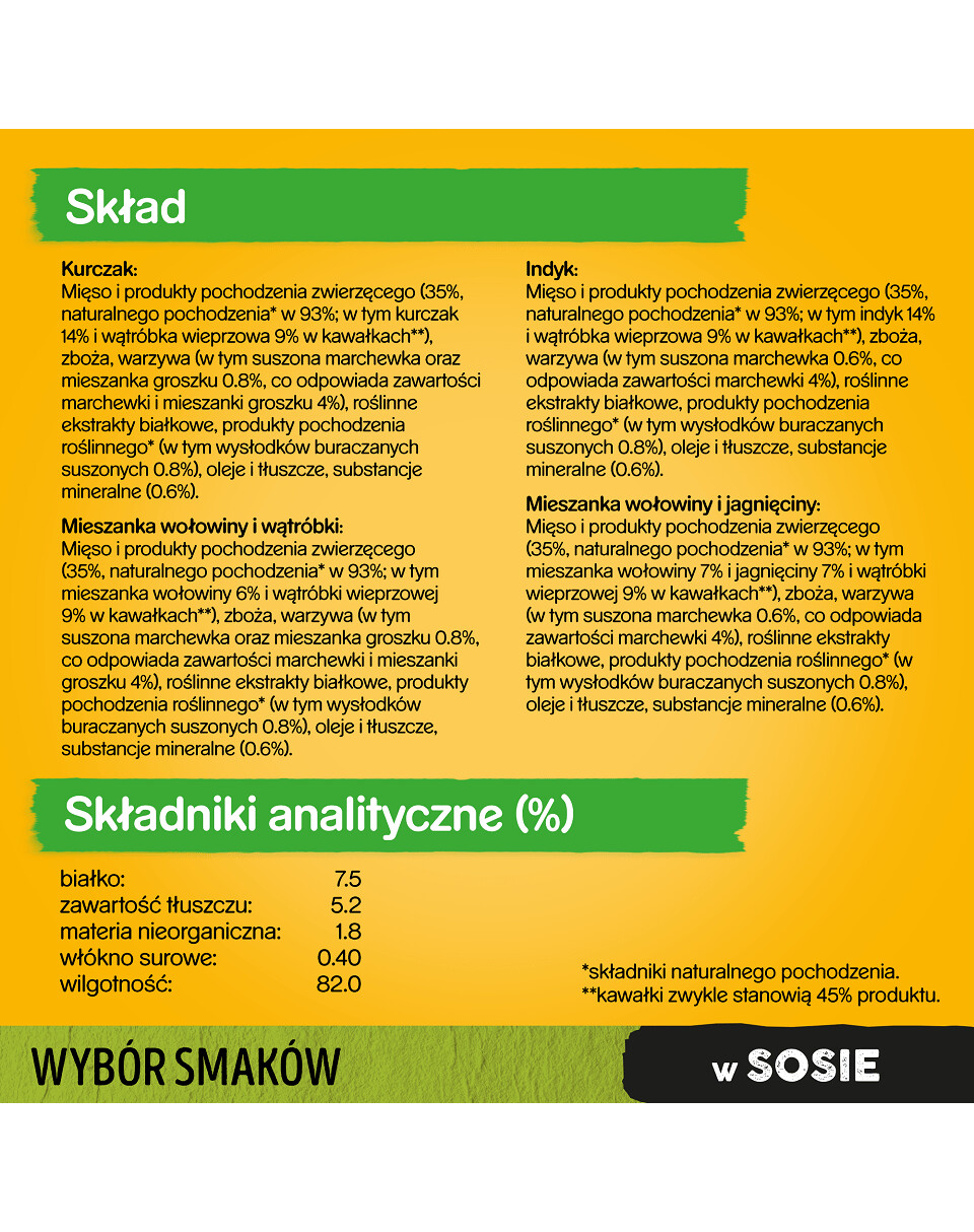 Kúsky bohaté na kuracie mäso: mäso a výrobky živočíšneho pôvodu (35 %, prírodného pôvodu^ 93 %; vrátane kuracieho mäsa 14 % a bravčovej pečene 9 % v kúskoch**), obilniny, zelenina (vrátane sušenej zmesi mrkvy a hrachu 0,8 %, čo zodpovedá zmesi mrkvy a hrachu 4 %), rastlinné bielkovinové extrakty, výrobky rastlinného pôvodu^ (vrátane sušenej repnej dužiny 0,8 %), oleje a tuky, minerálne látky (0,6 %). ^ Zložky prírodného pôvodu. **Kúsky zvyčajne tvoria 45 % výrobku.