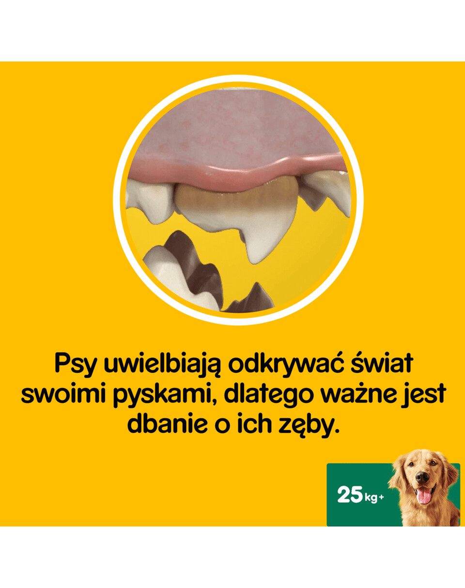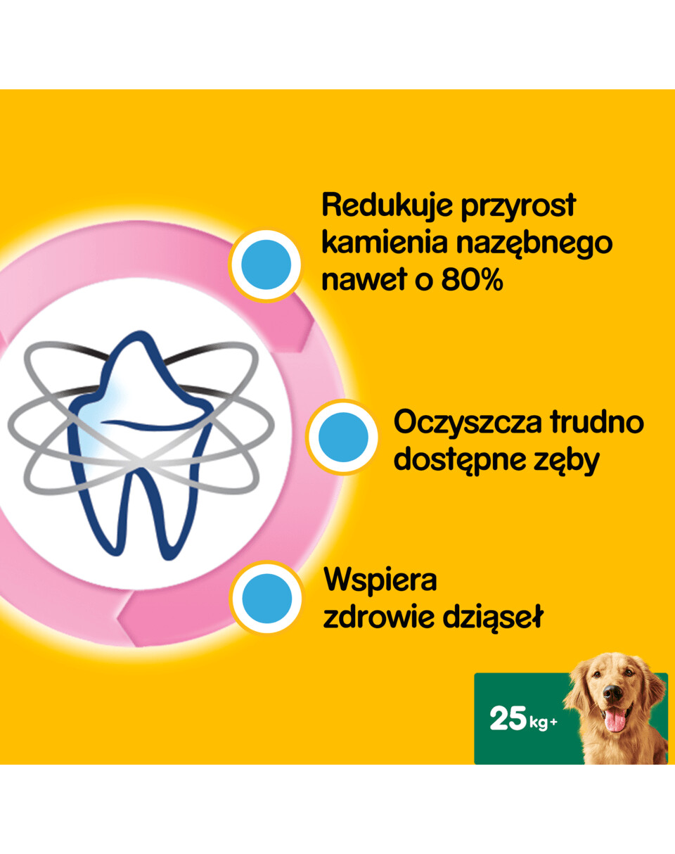 PEDIGREE DentaStix Daily Dental Care je zubná maškrta s trojitým účinkom určený pre psy veľkých plemien starších ako 4 mesiace. PEDIGREE DentaStix podporuje zdravie ďasien vášho psa, čistí ťažko dostupné zuby a znižuje tvorbu zubného kameňa vďaka svojmu jedinečnému tvaru, výnimočnej konzistencii a aktívnym zložkám (tripolyfosfát sodný). Aj psy, ktoré PEDIGREE Dentastix zjedia veľmi rýchlo, potrebujú na to obrovské množstvo žuvacích pohybov. Psy, ktorí produkt zjedia v najkratšom čase (40-50 sekúnd), vykonajú 90 až 130 žuvacích pohybov, aby zjedli svoju desiatu. Ústna hygiena je veľmi dôležitým prvkom starostlivosti o pohodu vášho psa, pretože až 4 z 5 psov starších ako 3 roky trpia ochorením ďasien spôsobeným hromadením plaku a zubného kameňa. S PEDIGREE DentaStix sa efektívne staráte o zdravie a vitalitu svojho psa.