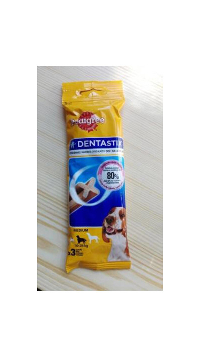 PEDIGREE DentaStix Daily Dental Care je zubná maškrta s trojitým účinkom určený pre stredne veľké psy staršie ako 4 mesiace. PEDIGREE DentaStix podporuje zdravie ďasien vášho psa, čistí ťažko dostupné zuby a znižuje tvorbu zubného kameňa vďaka svojmu jedinečnému tvaru, výnimočnej konzistencii a aktívnym zložkám (tripolyfosfát sodný). Aj psy, ktoré PEDIGREE Dentastix zjedia veľmi rýchlo, potrebujú na to obrovské množstvo žuvacích pohybov. Psy, ktorí produkt zjedia v najkratšom čase (40-50 sekúnd), vykonajú 90 až 130 žuvacích pohybov, aby zjedli svoju desiatu. Ústna hygiena je veľmi dôležitým prvkom starostlivosti o pohodu vášho psa, pretože až 4 z 5 psov starších ako 3 roky trpia ochorením ďasien spôsobeným hromadením plaku a zubného kameňa. S PEDIGREE DentaStix sa efektívne staráte o zdravie a vitalitu svojho psa.