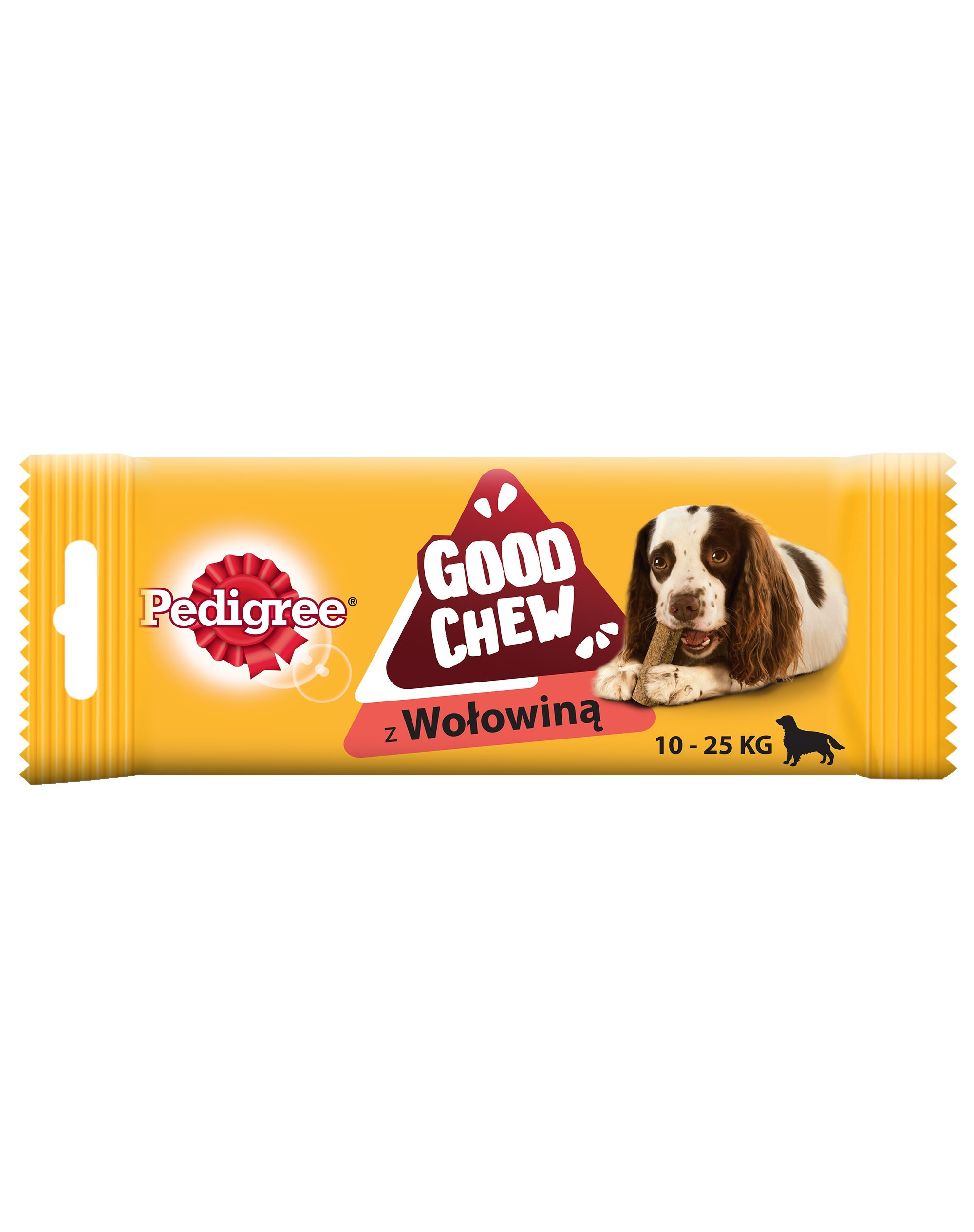Pedigree Good Chew je vyrobené z hovädzieho a vďaka neodolateľnej chuti a tuhej konzistencií sa teší u psov veľkej obľube. Textúra snacku je uprostred mäkká aj tvrdá - snack je tak pre psa nielen lákavý, ale aj šetrný k jeho zubom. Žuvací snack Pedigree Good Chew je k dostaniu v rôznych veľkostiach - pre psov malých, stredných i veľkých plemien.