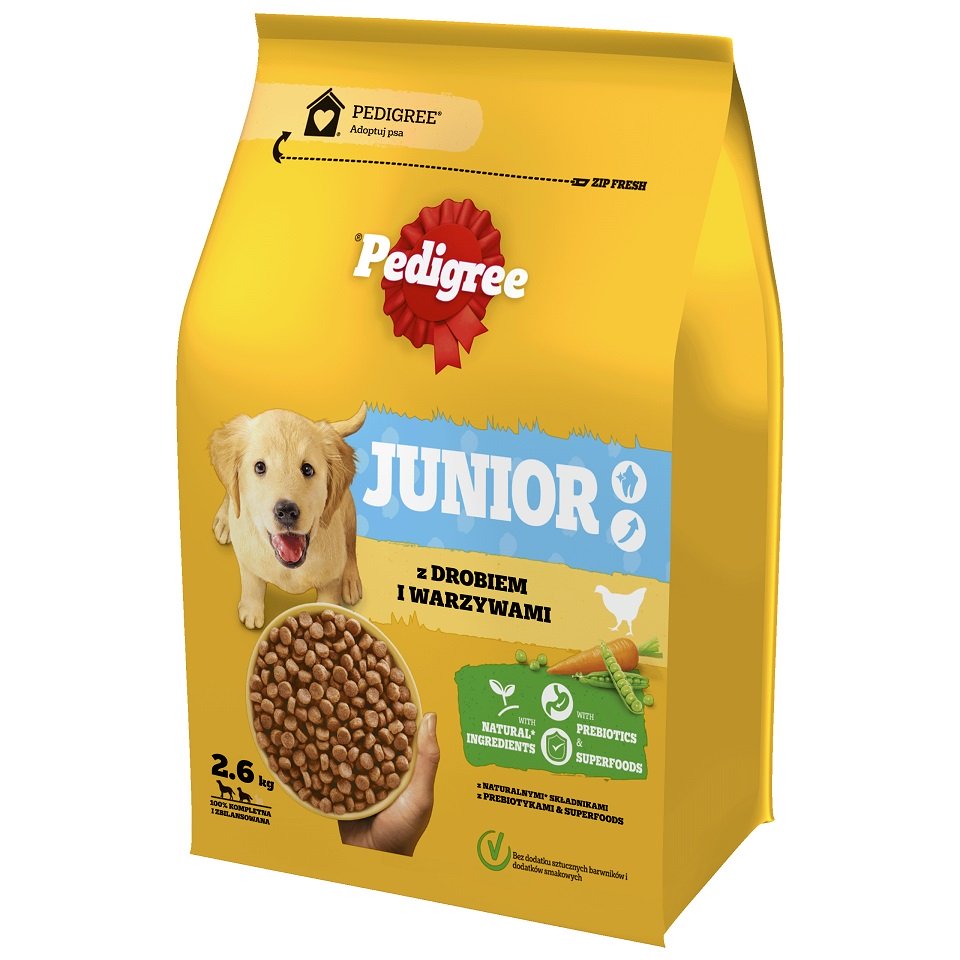 Suché krmivo PEDIGREE Junior s hydinou a zeleninou je kompletné krmivo so všetkými minerálmi a vitamínmi potrebnými pre zdravý vývoj. Je určené pre rastúce psy veľkých a stredných plemien. Receptúra, ktorú vyvinuli veterinári a odborníci na výživu z WALTHAM Institute of Animal Science, obsahuje prebiotiká a superpotraviny: mrkvu, ktorá je zdrojom vitamínu A z beta karoténu, a hrášok, ktorý je zdrojom vlákniny a minerálnych látok. Vaše rastúce zviera si zaslúži zdravý úsmev, preto krmivo PEDIGREE Junior obsahuje správne množstvo vápnika na podporu zdravého vývoja zubov. Veľkosť granúl je špeciálne prispôsobená veľkosti čeľustí šteniat. Vitamín E v zložení podporuje prirodzené obranné mechanizmy, takže váš pes môže pokračovať v objavovaní veľkého, úžasného sveta. Krmivo PEDIGREE Junior obsahuje vlákninu, prebiotiká a ľahko stráviteľné hydinové mäso, ktoré sa ľahko vstrebáva vyvíjajúcim sa tráviacim systémom, pretože každé šteňa si zaslúži zdravé bruško.