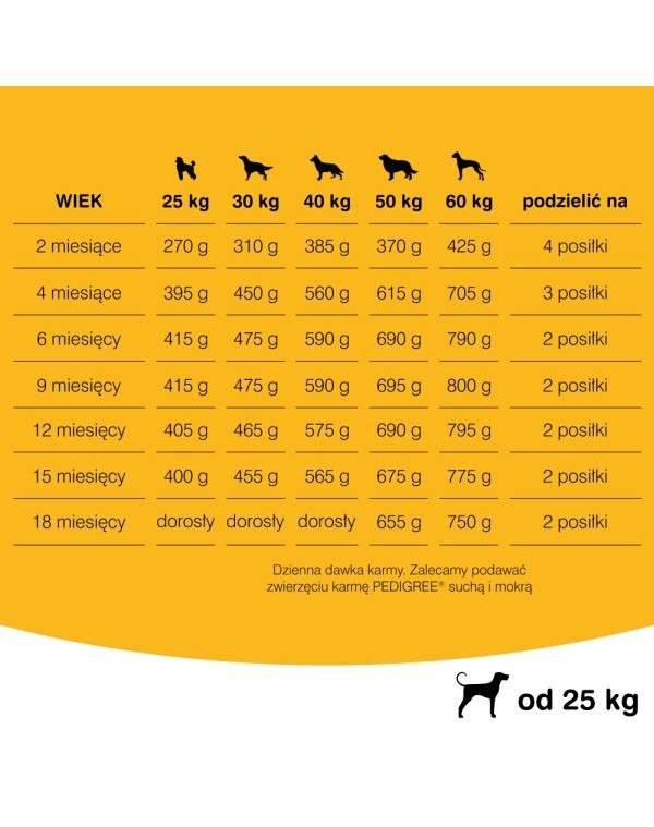 • Pes s predpokladanou telesnou hmotnosťou 25 kg v dospelosti: vo veku 2 mesiacov 280 g krmiva denne rozdeleného do 4 jedál, vo veku 4 mesiacov 390 g krmiva denne rozdeleného do 3 jedál, v 6. mesiaci veku 410 g stravy denne rozdelená do 2 jedál, vo veku 9 mesiacov 405 g stravy denne rozdelená do 2 jedál, vo veku 12 mesiacov 395 g stravy denne rozdelená do 2 jedál, vo veku 15 rokov 15 mesiacov 390 g jedla denne rozdelených do 2 jedál.