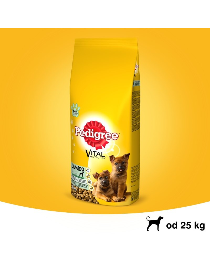 Vzhľadom na šteňatá veľkých plemien vo veku od 2 do 18 mesiacov sme vyvinuli PEDIGREE® Vital Protection Junior Rich in Chicken, s ryžou. Toto krmivo má zabezpečiť ich optimálny vývoj vďaka ideálnemu pomeru základných živín. Psy dostávajú podporu pre svoje 4 najdôležitejšie potreby: krmivo podporuje ich prirodzene silnú obranyschopnosť, pomáha udržiavať zdravú srsť a kožu, podporuje dobré trávenie a silné zuby. PEDIGREE® Vital Protection je kompletné a vyvážené krmivo navrhnuté tak, aby z vášho domáceho maznáčika vyrástol zdravý a silný pes. Toto krmivo bolo vyvinuté odborníkmi na výživu a veterinármi v Centre výživy zvierat WALTHAMTM. Neobsahuje umelé farbivá.