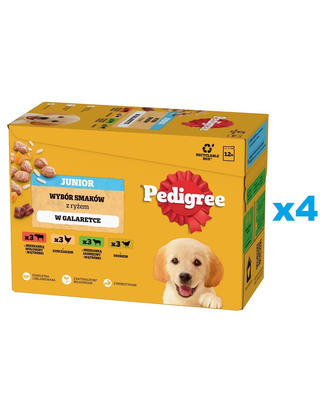 PEDIGREE Selection of Flavours with Rice in Jelly je kompletné krmivo pre rastúce psy vyvinuté veterinármi a odborníkmi na výživu z WALTHAMTM Institute of Animal Science. Mäsité kúsky bohaté na bielkoviny, zaliate v chutnom želé, uspokoja chute aj toho najnáročnejšieho psa. Špeciálne vyvinuté zloženie bez umelých dochucovadiel a konzervačných látok obsahuje prírodné zložky, vitamíny a minerály. Vitamín E obsiahnutý v krmive podporuje imunitný systém vášho domáceho maznáčika. Vláknina podporuje činnosť čriev, čím zabezpečuje zdravé trávenie, a vďaka zníženému obsahu kalórií* sa postaráte o jeho štíhlu postavu. Balenie obsahuje 4 príchute: 3x kúsky bohaté na kuracie mäso, 3x kúsky bohaté na hydinové mäso, 3x kúsky bohaté na zmes jahňacieho mäsa a pečene a 3x kúsky bohaté na zmes hovädzieho mäsa a pečene.