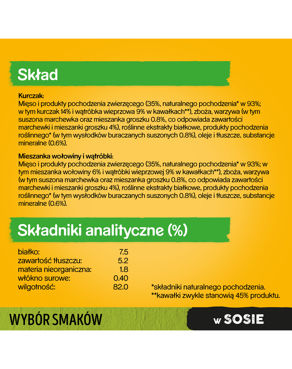 z kurczakiem i warzywami: mięso i produkty pochodzenia zwierzęcego 30% (w tym 4% kurczaka), warzywa (4% marchewka i groszek), zboża, produkty pochodzenia roślinnego (0.5% wysłodków buracznych), substancje mineralne, oleje i tłuszcze (0.45% oleju słonecznikowego), roślinne ekstrakty białkowe