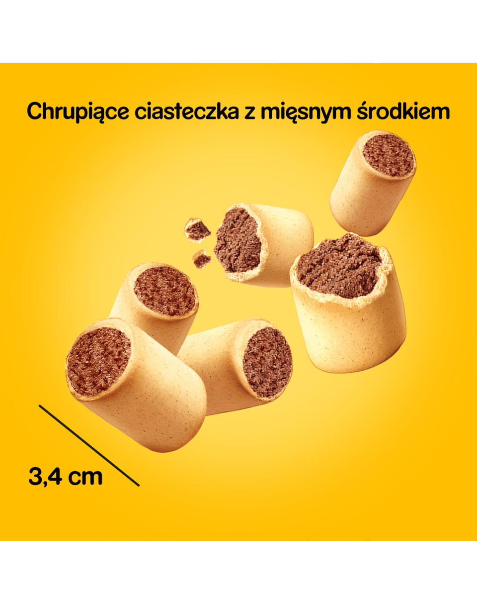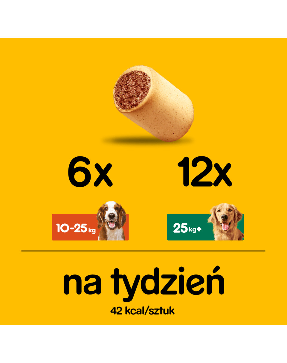 Stredné plemená psov, napr. kokeršpaniel: Kŕmte až 9 sušienok týždenne. Veľké plemená psov, napr. plemeno Labrador: Kŕmte až 18 maškrty pre psov týždenne. Určené pre dospelých psov.