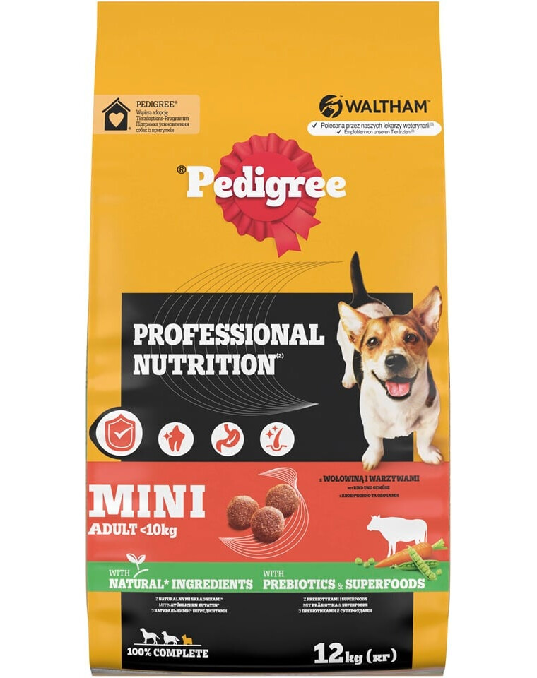 Suché krmivo PEDIGREE Professional Nutrition je 100% plnohodnotné a vyvážené jedlo, pripravené z prírodných zložiek a s prídavkom vitamínov, minerálov a prebiotík – všetkého, čo každý pes potrebuje, aby mal energiu na radostný, plný život. Bez prídavku umelých farbív a príchutí.