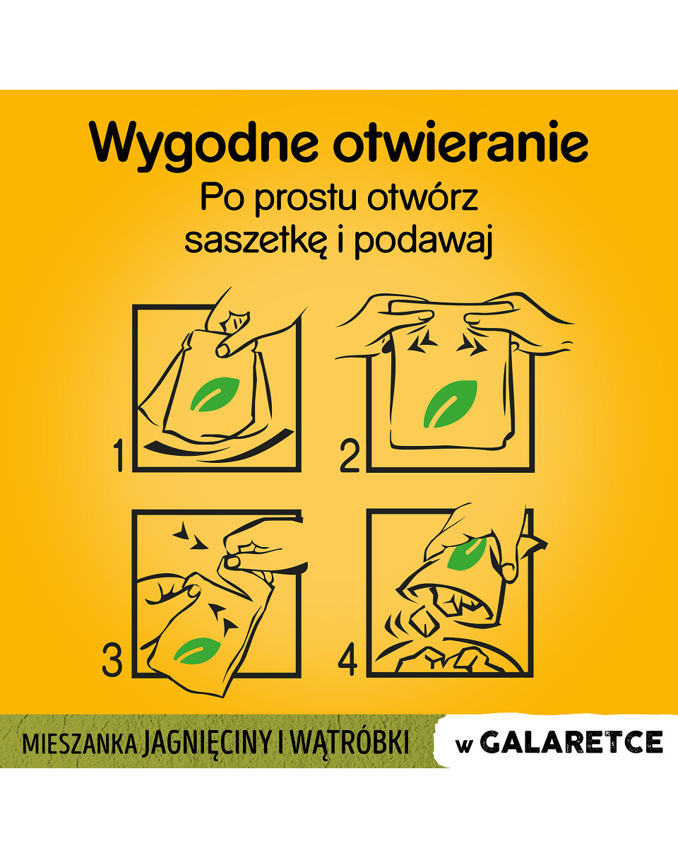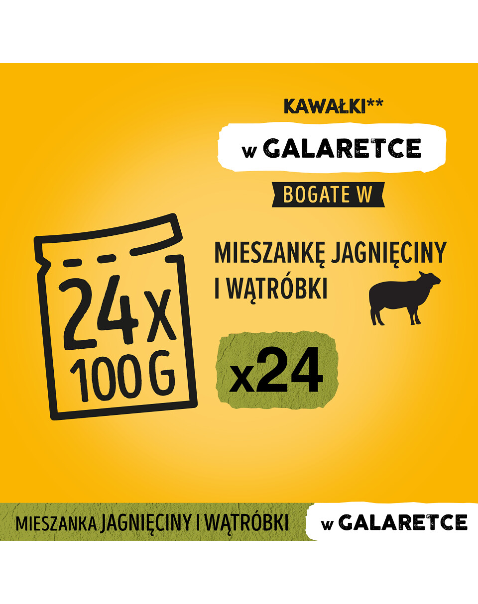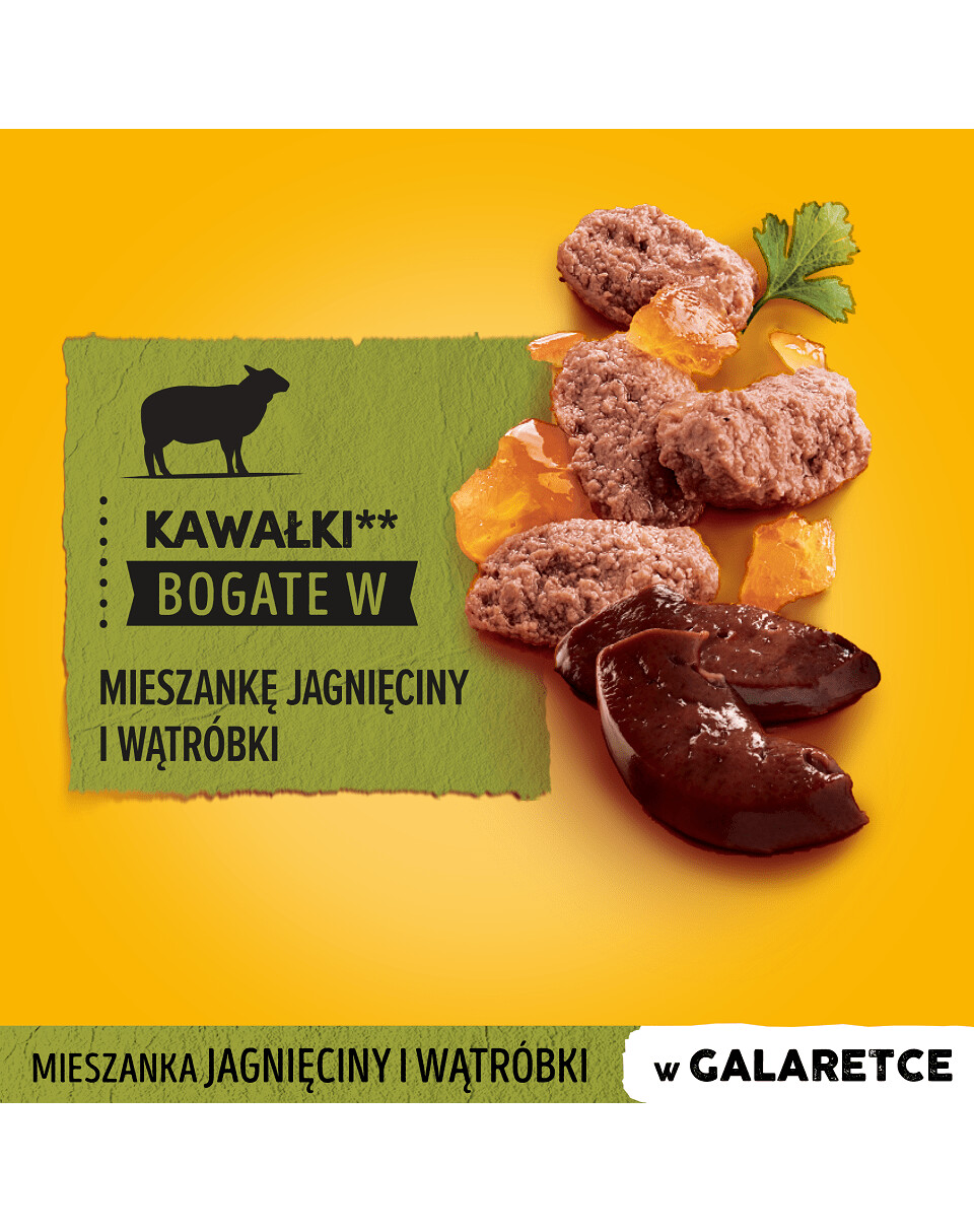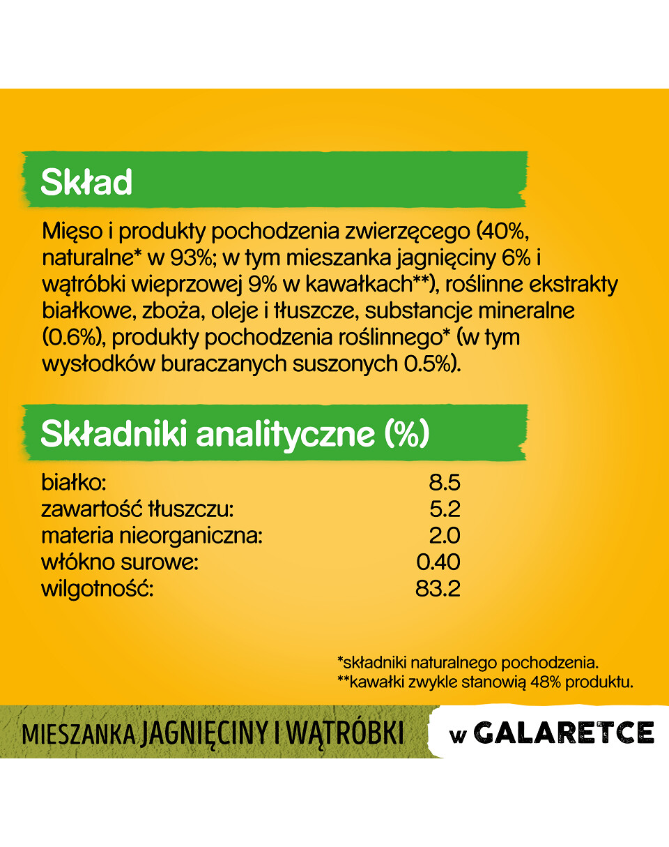 Zloženie: mäso a živočíšne produkty (40 %, prírodného pôvodu* z 93 %; vrátane zmesi jahňacej pečene 6 % a bravčovej pečene 9 % v kusoch**), rastlinné bielkovinové extrakty, obilniny, oleje a tuky, minerály (0,6 %), rastlinné produkty* (vrátane su. ^zložky prírodného pôvodu. **kúsky obvykle tvoria 48 % produktu.