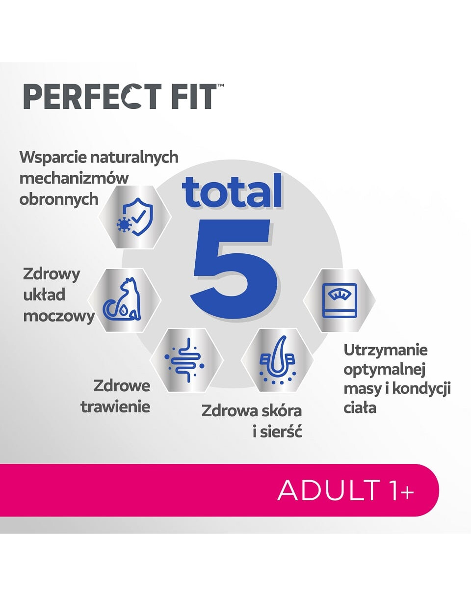 Pochúťka Perfect Fit Adult 1+ bohatá na čerstvého lososa obsahuje jedinečnú formulu Total 5, ktorá podporuje 5 najdôležitejších oblastí zdravia dospelého miláčika: podporuje silný imunitný systém, zdravé trávenie, zdravý močový systém, zdravú pokožku a srsť a udržanie optimálnej kondície a hmotnosti. Receptúra Perfect Fit Adult 1+ bola vyvinutá v spolupráci s veterinármi a odborníkmi na výživu z Inštitútu vedy o zvieratách WALTHAM, aby poskytla nevyhnutné živiny dospelým mačkám. Rovnako ako iné varianty, aj krmivo Perfect Fit Adult 1+ bohaté na čerstvého lososa poskytuje ďalšie výhody: podporuje vitalitu a obratnosť, silné svaly, zdravé ďasná a zuby, a obsahuje prírodné prebiotiká na starostlivosť o črevný mikrobióm. Výberom tohto krmiva pre svojho miláčika máte istotu, že jedinečná formula Perfect Fit podporuje zdravie celého organizmu vašej mačky a poskytuje jej ďalšie zdravotné výhody, ktoré sú špeciálne prispôsobené jej veku a individuálnym požiadavkám.