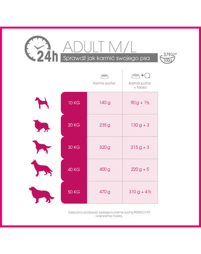 Pes s hmotnosťou 10 kg potrebuje 145 g suchého krmiva alebo 90 g suchého krmiva a 1,5 vaničky vlhkého krmiva denne, pes s hmotnosťou 20 kg potrebuje 240 g suchého krmiva alebo 135 g suchého krmiva a 3 vaničky vlhkého krmiva denne, pes s hmotnosťou 30 kg potrebuje 325 g suchého krmiva alebo 185 g suchého krmiva a 4 vaničky vlhkého krmiva denne, 40 kg pes potrebuje 405 g suchého krmiva alebo 265 g suchého krmiva a 4 vaničky vlhkého krmiva denne, 50 kg pes potrebuje 480 g suchého krmiva alebo 320 g suchého krmiva a 4 a pol vaničky vlhkého krmiva denne.