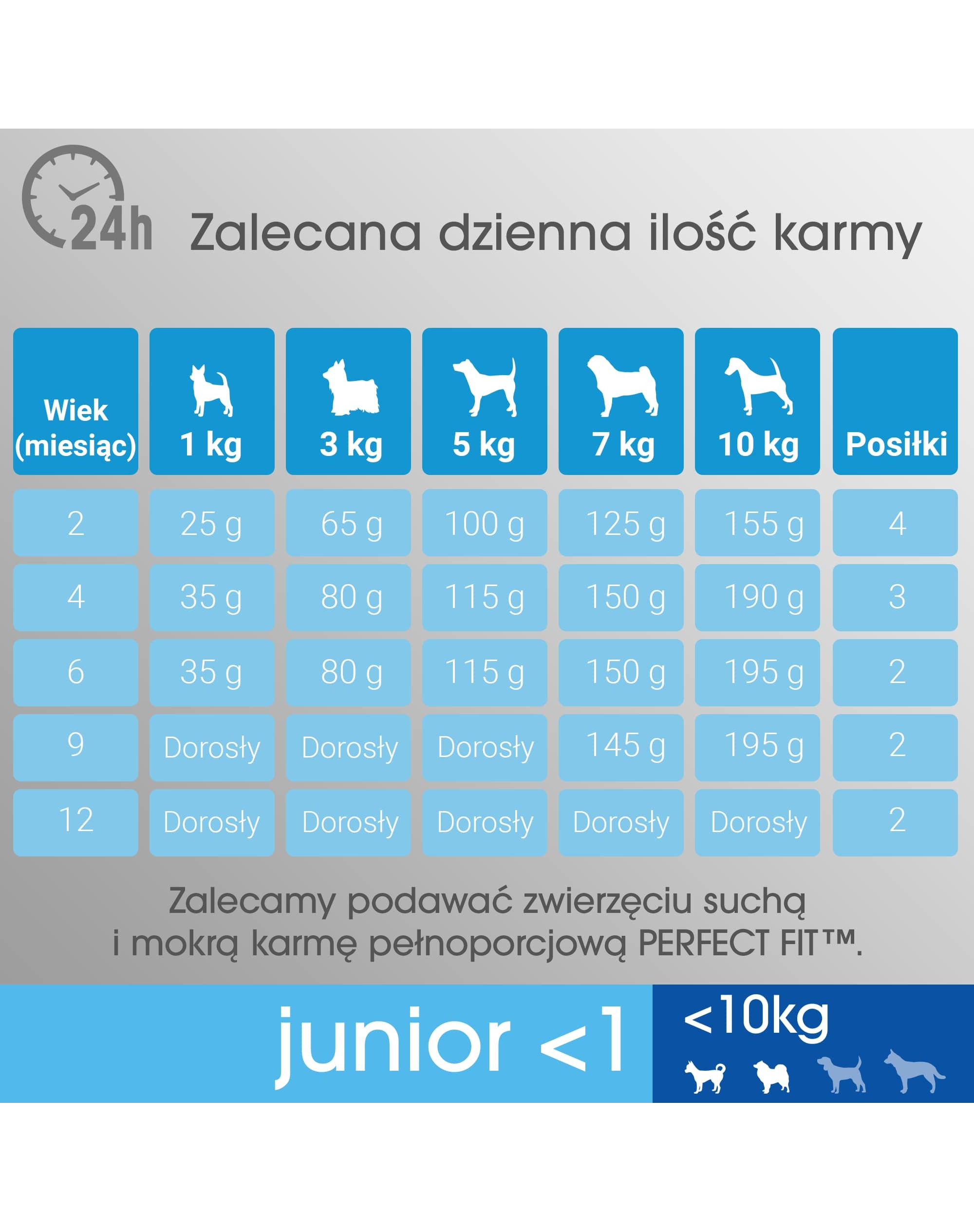 Pes s predpokladanou hmotnosťou 10 kg v dospelosti: vo veku 2 mesiacov - 155 g krmiva denne rozdelených do 4 jedál, vo veku 4 mesiacov - 195 g krmiva denne rozdelených do 3 jedál, vo veku 6 mesiacov - 200 g krmiva denne rozdelených do 2 jedál, vo veku 9 mesiacov - 195 g krmiva denne rozdelených do 2 jedál, vo veku 12 mesiacov - 190 g krmiva denne rozdelených do 2 jedál.
