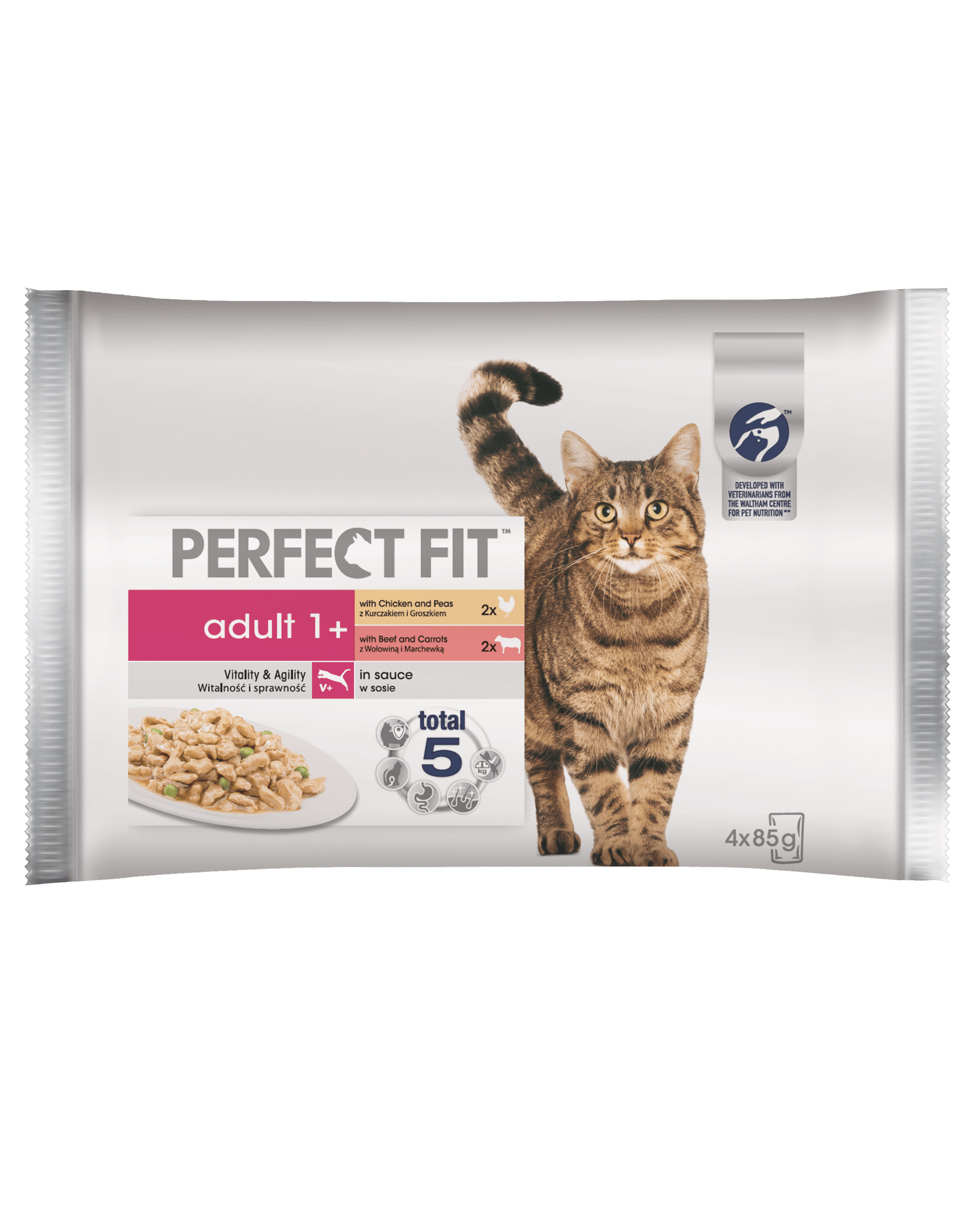 Pre dospelé mačky (staršie ako 1 rok) sme vytvorili mokré krmivo Perfect Fit Adult 1+ s kuracím mäsom a hráškom a s hovädzím mäsom a mrkvou. Jedná sa o kompletné, vyvážené a chutné krmivo pre vášho maznáčika. Unikátnu receptúru Perfect Fit vyvinuli nutriční špecialisti a veterinári z Centra výživy zvierat WALTHAM. Vďaka tomu efektívne uspokojuje 5 základných zdravotných potrieb mačky. Krmivo Perfect Fit sme prispôsobili individuálnym potrebám vášho maznáčika, takže si môžete byť istí, že sa oňho staráte tým najlepším možným spôsobom. Dokonale zložená receptúra a špeciálna kombinácia vitamínov a minerálov pomôžu vašej dospelej mačke udržať si plnú kondíciu a vitalitu a vyvážený obsah bielkovín navyše posilní jej svaly. Doprajte svojej mačke každý deň tú najlepšiu a komplexnú výživu.