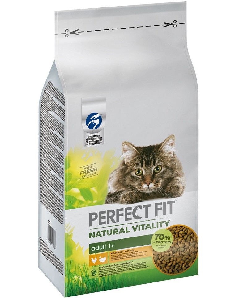 Čím kŕmiť svoju mačku každý deň? Siahnite po krmive PERFECT FIT™ Natural Vitality pre mačky s kuracím a morčacím mäsom. Vyznačuje sa unikátnou receptúrou vyvinutou veterinármi a odborníkmi na výživu z WALTHAM™ Institute of Animal Science. V súlade s nutričnými požiadavkami absolútnych mäsožravcov, akými sú mačky, sa krmivo pre mačky PERFECT FIT ™ Natural Vitality s kuracím a morčacím mäsom vyznačuje vysokým obsahom živočíšnych bielkovín. Podporuje rozvoj svalov a poskytuje aminokyseliny potrebné pre zdravý život. PERFECT FIT™ Natural Vitality s kuracím a morčacím mäsom spĺňa nutričné potreby mačky, ktoré sú vlastné jej povahe.
