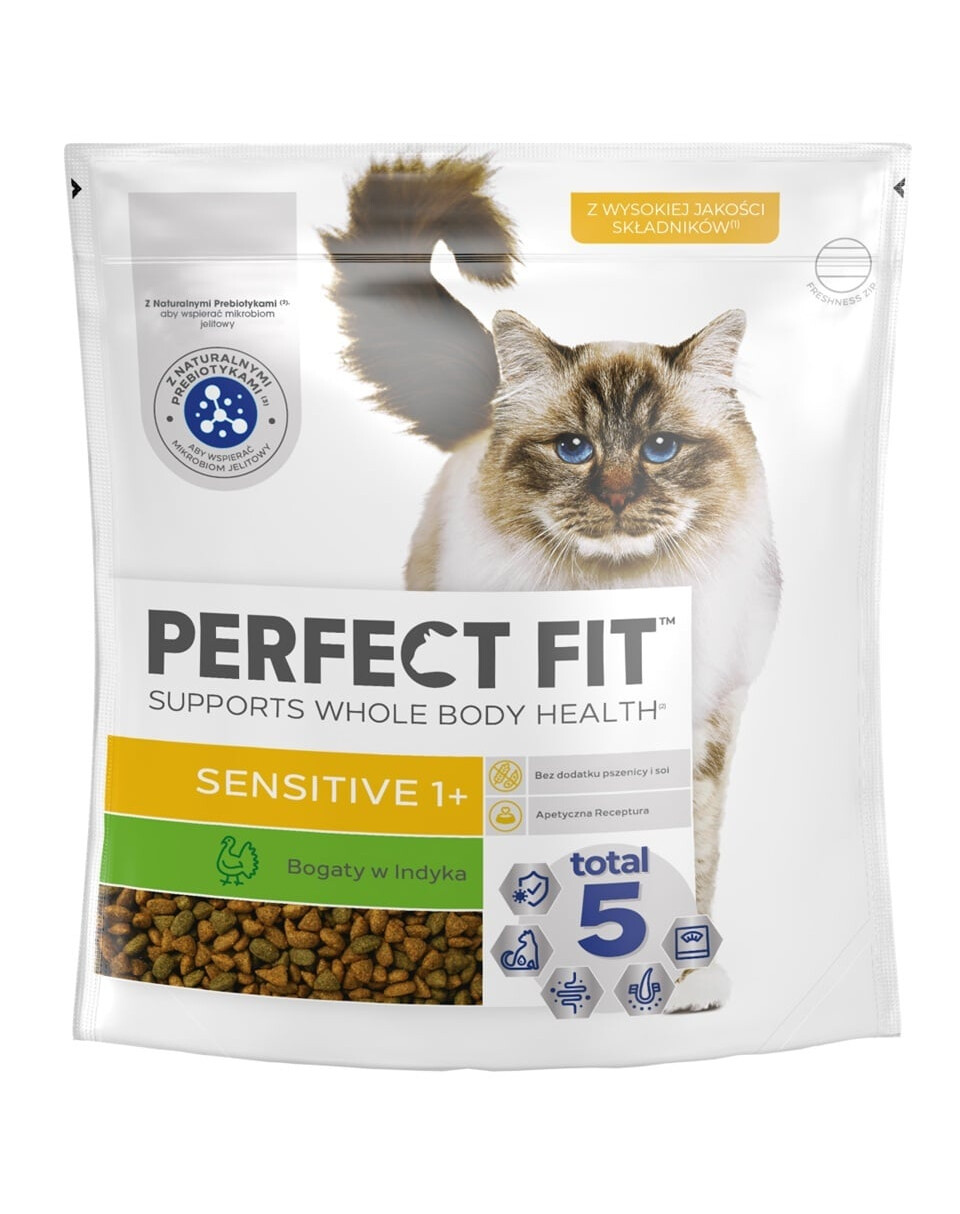 Pochúťka Perfect Fit Sensitive 1+ bohatá na morčacie mäso obsahuje jedinečnú formulu Total 5, ktorá podporuje 5 najdôležitejších oblastí zdravia dospelého maznáčika: podporuje silný imunitný systém, zdravé trávenie, zdravý močový systém, zdravú pokožku a srsť a udržanie optimálnej kondície a hmotnosti. Receptúra Perfect Fit Sensitive 1+ bola vyvinutá v spolupráci s veterinármi a odborníkmi na výživu z Inštitútu vedy o zvieratách WALTHAM, aby poskytla nevyhnutné živiny dospelým, citlivým mačkám. Rovnako ako iné varianty, aj krmivo Perfect Fit Sensitive 1+ bohaté na morčacie mäso poskytuje ďalšie výhody: je vyrobené bez pšenice a sóje, má chutnú receptúru a obsahuje prírodné prebiotiká, aby sa staralo o črevný mikrobiom. Výberom tohto krmiva pre svojho citlivého maznáčika máte istotu, že jedinečná formula Perfect Fit podporuje zdravie celého organizmu vašej mačky a poskytuje jej ďalšie zdravotné výhody, ktoré sú špeciálne prispôsobené jej veku a individuálnym požiadavkám.