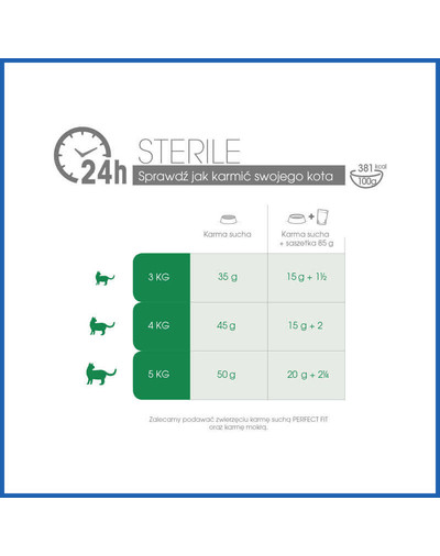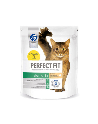 Perfect Fit Sterile 1+ bol vyvinutý za účasti veterinárnych lekárov a špecialistov na výživu z WALTHAM Pet Nutrition Center. Je to lahodné krmivo, ktoré obsahuje unikátne zloženie Total 5, ktoré poskytuje vašej mačke ochranu zdravia, ktorú každý deň potrebuje. Perfect Fit však nie je len receptúra Total 5 – variant bohatý na kuracie mäso poskytuje 3 ďalšie výhody, ktoré súvisia so zdravím a životným štýlom vašej mačky. S týmto krmivom, prispôsobeným jeho špecifickým potrebám, si môžete byť istí, že váš maznáčik dostane to správne krmivo pre neho.