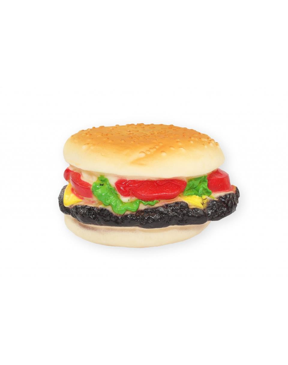 Hračka v podobe hamburgera s piskotom je vyrobená z odolnej