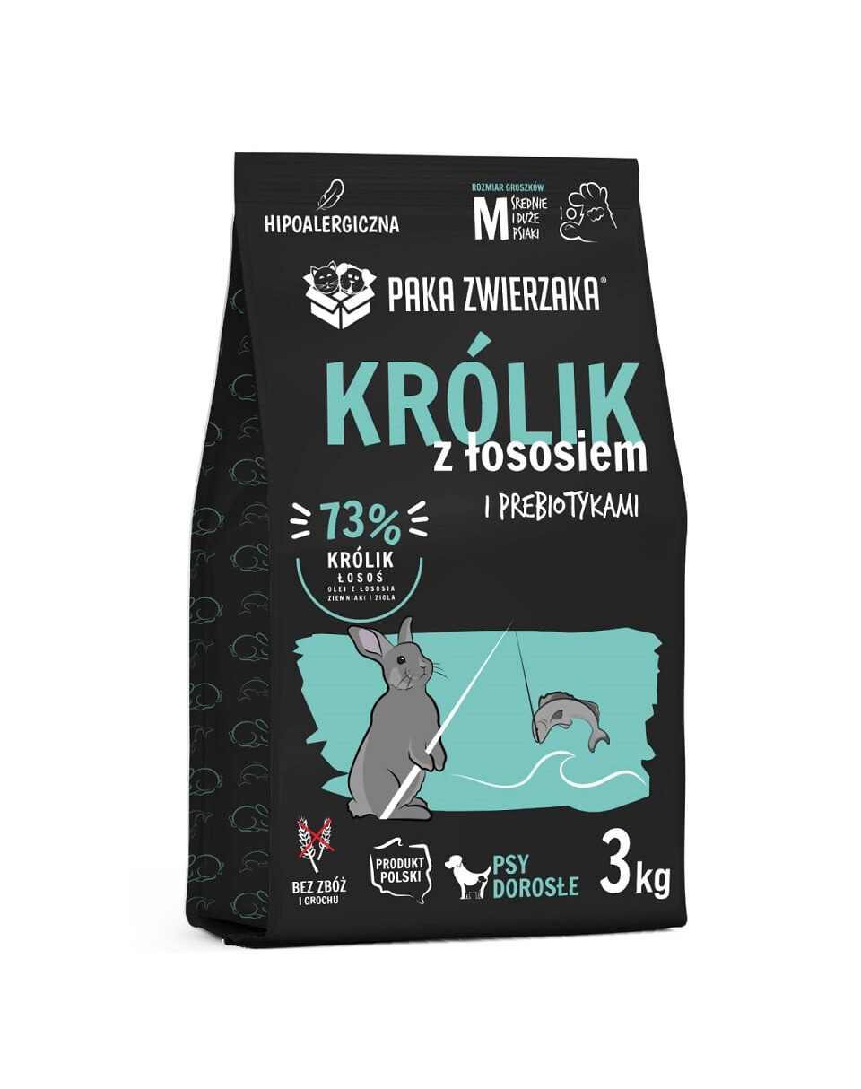 Dokonale vyvážená suchá krmivo kvality SUPERPREMIUM bez obilnín, hrachu, kukurice, sóje, konzervantov a umelých farbív. Najvyššej kvality mäso králika, lososa, zeleniny a byliniek získavané od miestnych dodávateľov zabezpečí vysokú chutnosť a ľahkú stráviteľnosť. Ideálna formula pre psov s citlivým žalúdkom a intoleranciou na obilniny.