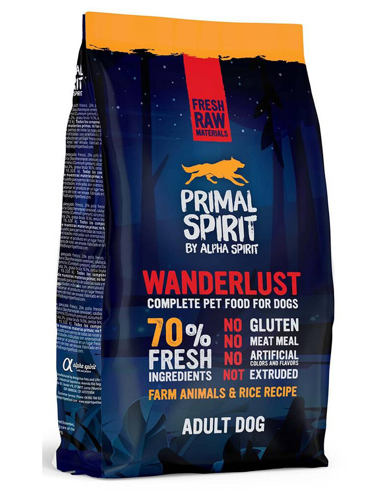 Primal Spirit Wanderlust je bezlepkové, polomäkké krmivo pre dospelých psov s ryžou a kuracím mäsom.