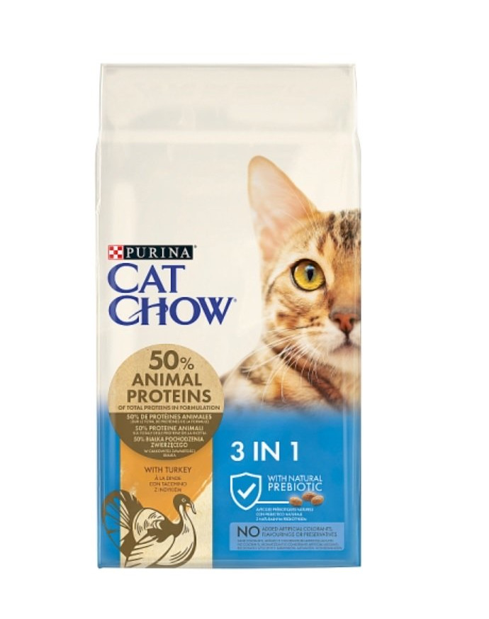 CAT CHOW 3 v 1 vzorec s trojitými dávkami, s preukázaným účinkom výrazne obmedzujúcim ukladanie zubného kameňa až o 40%. Obsahuje vyvážené minerály pre zdravie močových ciest a špeciálne formulovaný prostriedok s zdrojmi vlákniny na trávenie, ktorý pomáha kontrolovať tvorbu vlasových guličiek.