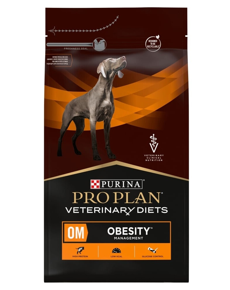 PURINA PRO PLAN Veterinary Diets Canine OM Obesity Management je špecializovaná veterinárna diéta pre dospelých psov, vytvorená na redukciu nadmernej hmotnosti a stabilizáciu hladiny glukózy u zvierat s cukrovkou. Krmivo má zníženú energetickú hodnotu a nízky obsah ľahko stráviteľných cukrov, čo podporuje kontrolovanú stratu tuku pri súčasnom zachovaní svalovej hmoty.