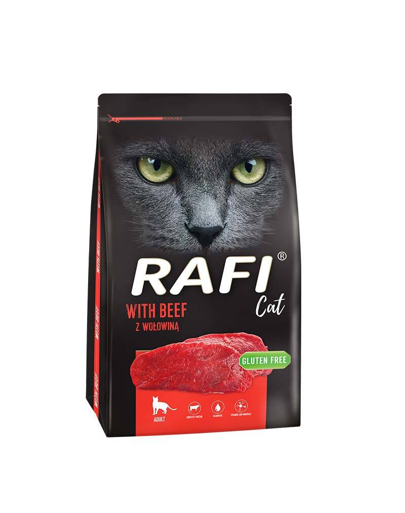 Rafi Cat suché krmivo pre mačky s hovädzím mäsom je kompletné krmivo pre mačky všetkých plemien.