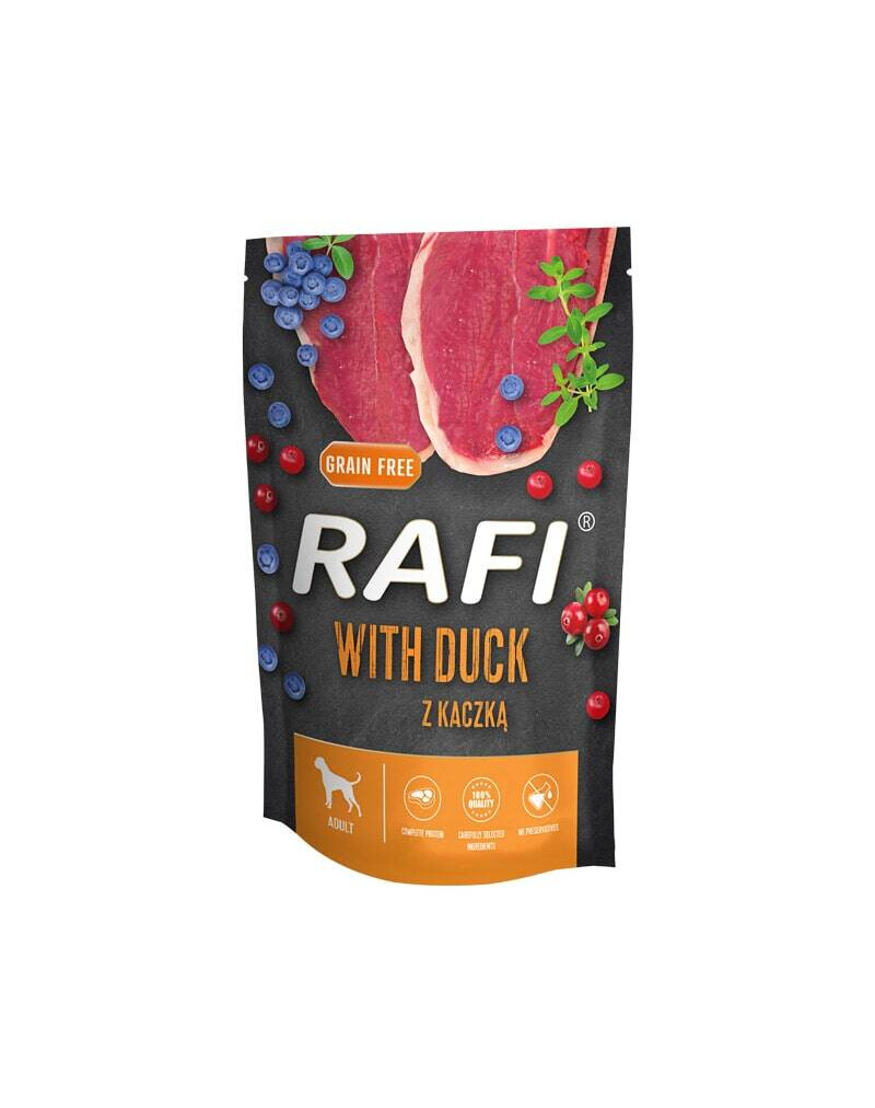 Zloženie obsahuje vysoký podiel kačacieho mäsa a živočíšnych produktov. To znamená, že toto vlhké krmivo poskytuje kompletný zdroj bielkovín so všetkými esenciálnymi aminokyselinami. Okrem toho je nedostatkovým zdrojom aminokyselín (najmä síry), a preto ho nie je potrebné dopĺňať obilnými produktmi. Kachné krmivo obsahuje správny pomer selénu, medi a železa, aby sa splnili denné požiadavky dospelého psa. Obzvlášť dôležitými zložkami mäsa a kačacieho vývaru sú mastné kyseliny zo skupiny n-6 a n-3, ktoré regulujú tráviaci systém. Prídavok tymiánu dodáva pokrmu arómu a chuť a podporuje tráviace funkcie. Čučoriedky chránia organizmus pred voľnými radikálmi a brusnice zabraňujú infekciám močových ciest.