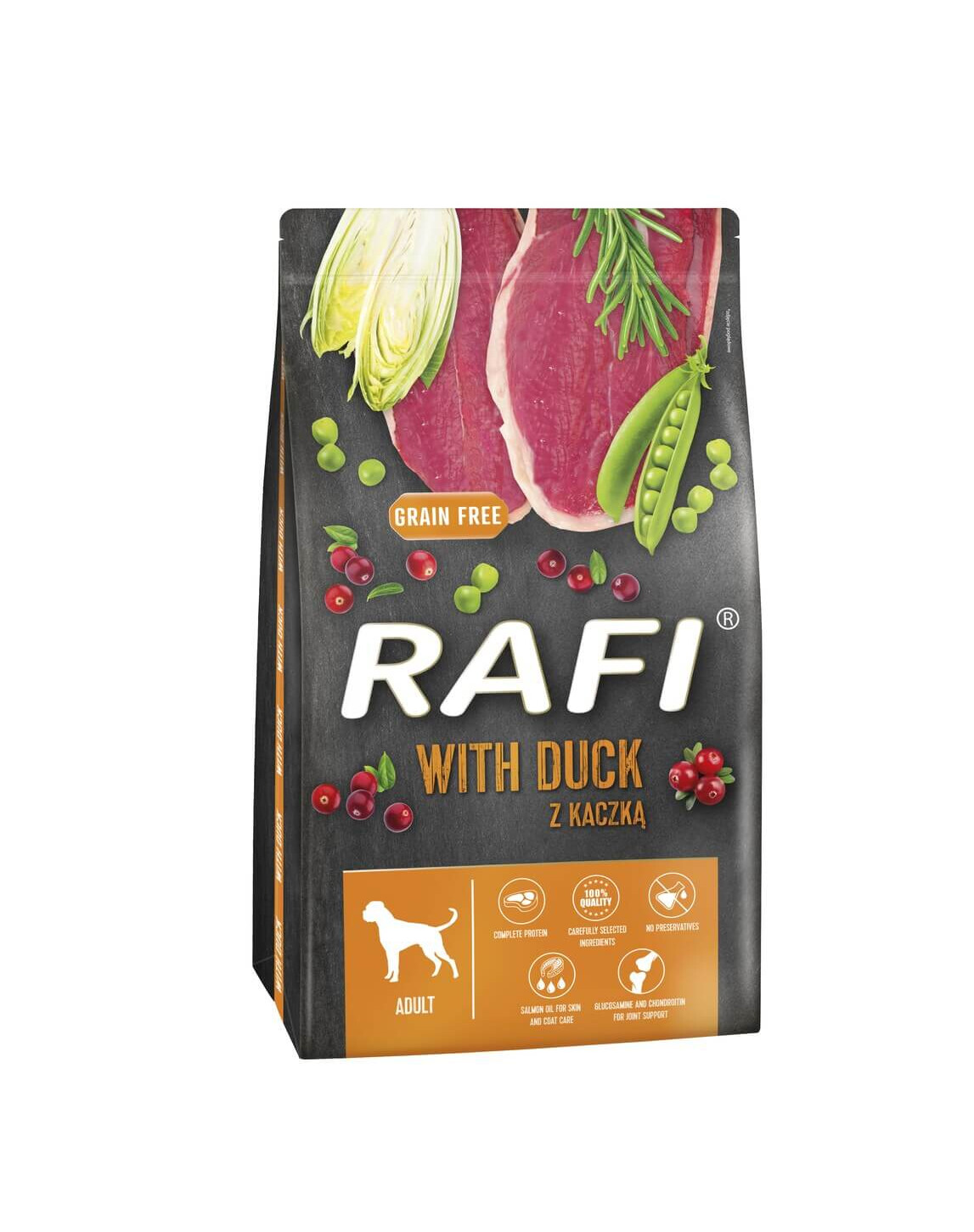 Zloženie mäso a výrobky živočíšneho pôvodu 35,5 % (vrátane sušenej kačice 4 %), zelenina (batáty, hrášok, sušená čakanka 0,5 % s obsahom FOS - fruktooligosacharidov a inulínu, sušená mrkva 0,5 %), oleje a tuky (vrátane lososového oleja 0,5 %), sušené mäso a výrobky živočíšneho pôvodu 0,5 % (vrátane sušeného kačacieho oleja 0,5 %),5%), výrobky rastlinného pôvodu (vrátane juky mojavskej 0,03%), semená (ľanové semeno 3%), minerálne látky, kvasnice, rozmarín 0,01%, glukosamín 0,01%, chondroitín sulfát 0,01%, ovocie (brusnice 0,005%).