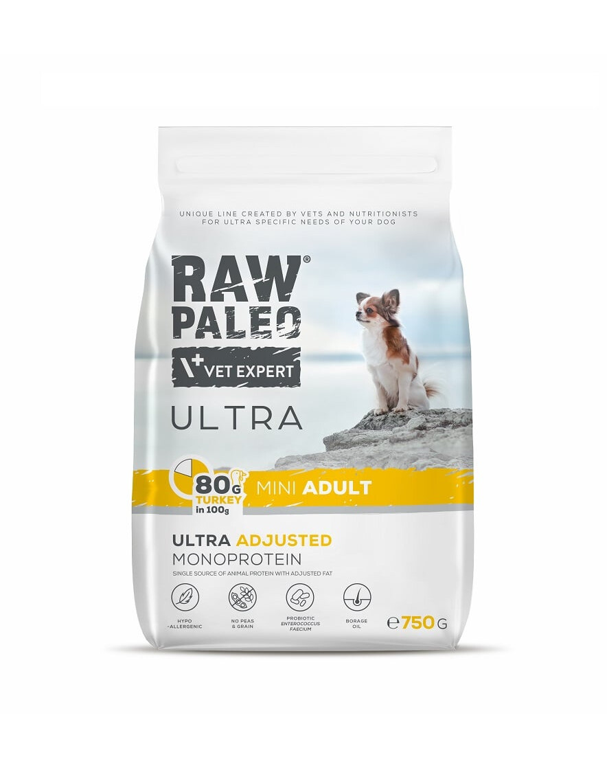 Raw Paleo Ultra Mini Adult Turkey je kompletné krmivo pre dospelých psov (starších ako 1 rok) malých plemien (s telesnou hmotnosťou do 8 kg). Krmivo je hypoalergénne a monoproteínové.