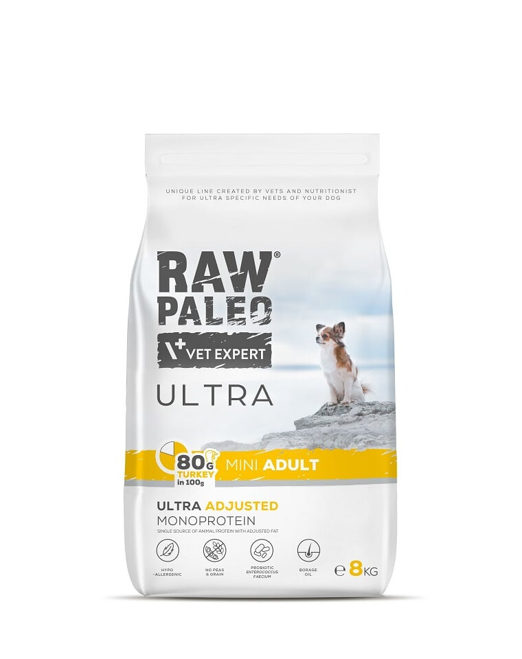 Raw Paleo Ultra Mini Adult Turkey je kompletné krmivo pre dospelých psov (starších ako 1 rok) malých plemien (s telesnou hmotnosťou do 8 kg). Krmivo je hypoalergénne a monoproteínové.