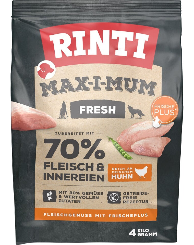 Rinti Max-i-Mum sa vyrába zo 65 % čerstvého mäsa a čerstvých