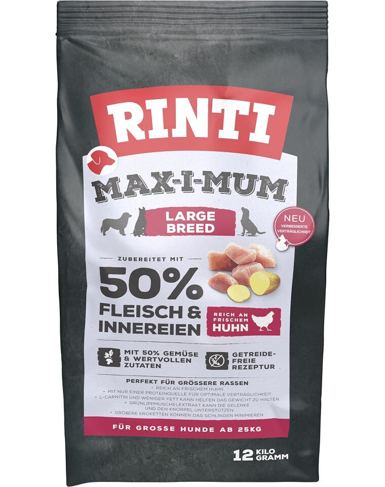 Krmivo Rinti Maximum Large Breed bolo vyvinuté špeciálne pre veľké psy s hmotnosťou minimálne 25 kg. Obsahuje 50 % mäsa a vnútorností a výlučne jednobielkovinové kuracie mäso pre citlivé žalúdky veľkých psov. Viac vlákniny na optimálnu kontrolu hmotnosti a L-karnitín na podporu metabolizmu tukov. Glukosamín (obsiahnutý vo výťažku zo slávky zelenoústej) pomáha udržiavať zdravé chrupavky a kĺby. Prirodzene bez obilnín, bez kukurice, lepku, sóje, zvýrazňovačov chuti a umelých prísad. Väčšie porcie jedla môžu pomôcť znížiť prejedanie sa. Psy sú od prírody mäsožravce, preto krmivo Rinti Max-i-Mum obsahuje veľké množstvo čerstvého mäsa spracovaného zložitým výrobným procesom a neobsahuje obilniny.