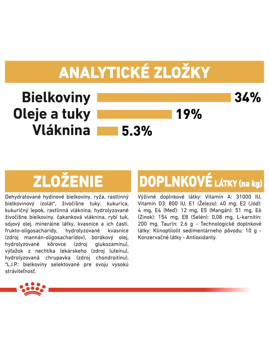 Doplnkové látky: Vitamín A: 31000 IU, Vitamín D3: 800 IU, E1 (železo): 40 mg, E2 (jód): 4 mg, E4 (meď): 12 mg, E5 (mangán): 51 mg, E6 (zinok): 154 mg, E8 (selén): 0,08 mg, L-karnitín: 200 mg, taurín: 2,6 g. Technologické doplnkové látky: klinoptilolit sedimentárneho pôvodu: 10 g. Konzervačné látky. Antioxidanty.