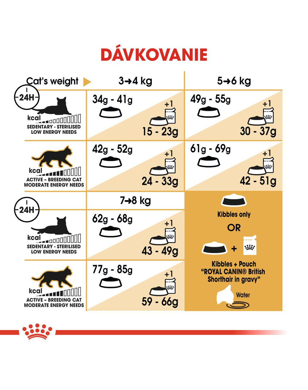 Aby mohlo uspokojiť chute čo najviac mačiek, krmivo ROYAL CANIN® British Shorthair Adult je dostupné aj vo vlhkej forme ako kúsky vo vynikajúcej šťave. Ak premýšľate nad kombinovaným kŕmením, jednoducho sa riaďte našimi pokynmi, aby vaša mačka dostávala to správne množstvo suchého aj vlhkého krmiva.
