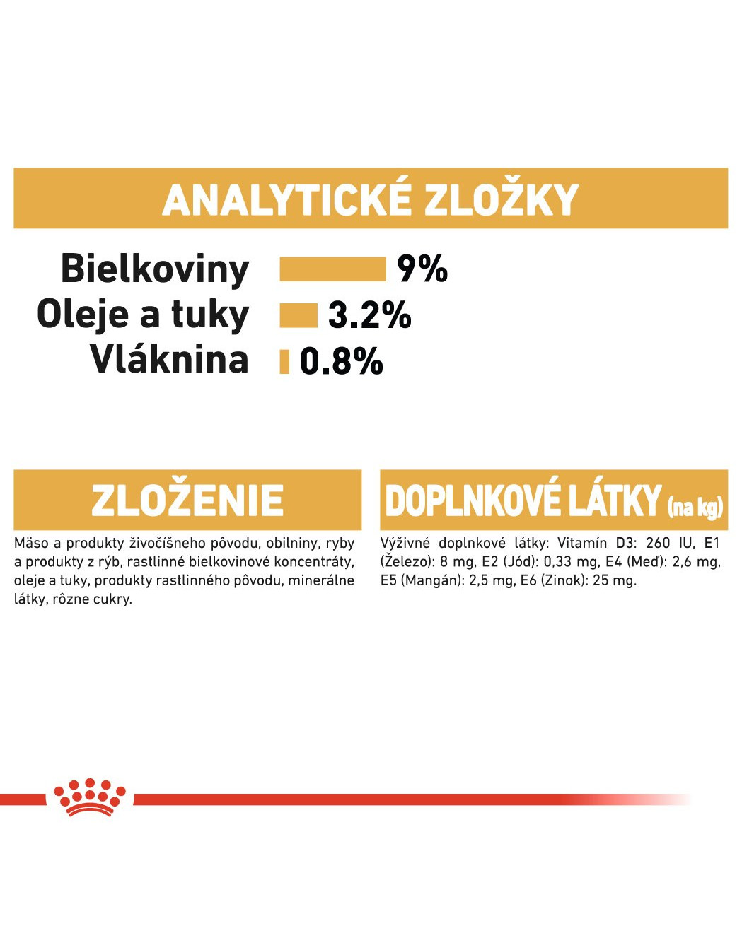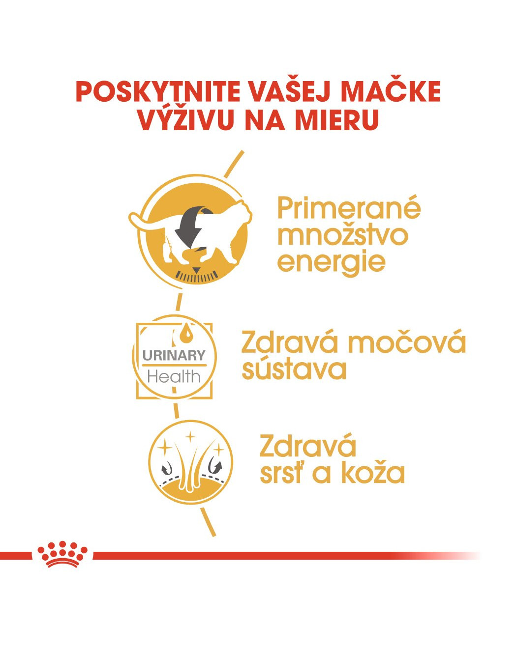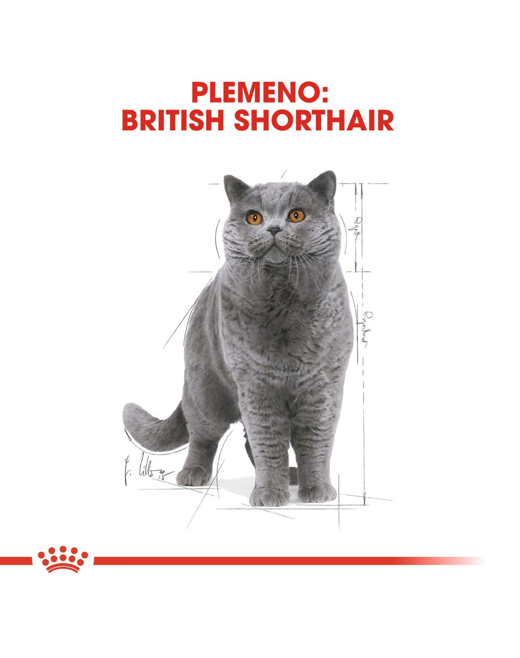 Britská mačka je podsaditá, ťažká a svalnatá. Hmotnosť vašej mačky by mala byť primárne tvorená svalmi, nie tukom. Preto je nevyhnutné podávať jej tie správne živiny v tých správnych porciách. Krmivo ROYAL CANIN® British Shorthair Adult in Gravy obsahuje stredný obsah energie a upravený obsah tukov (3,2 %), aby vaša mačka nezačala nechtiac priberať. Aby zostala krátka, hustá a plyšová srsť vašej mačky zdravá, krmivo obsahuje špecifickú rovnováhu živín, vrátane rôznych vitamínov, ktoré nevyživujú iba srsť, ale aj kožu. Navyše sa špeciálne vytvorená rovnováha minerálov v krmive stará o zdravie močových ciest vašej mačky.