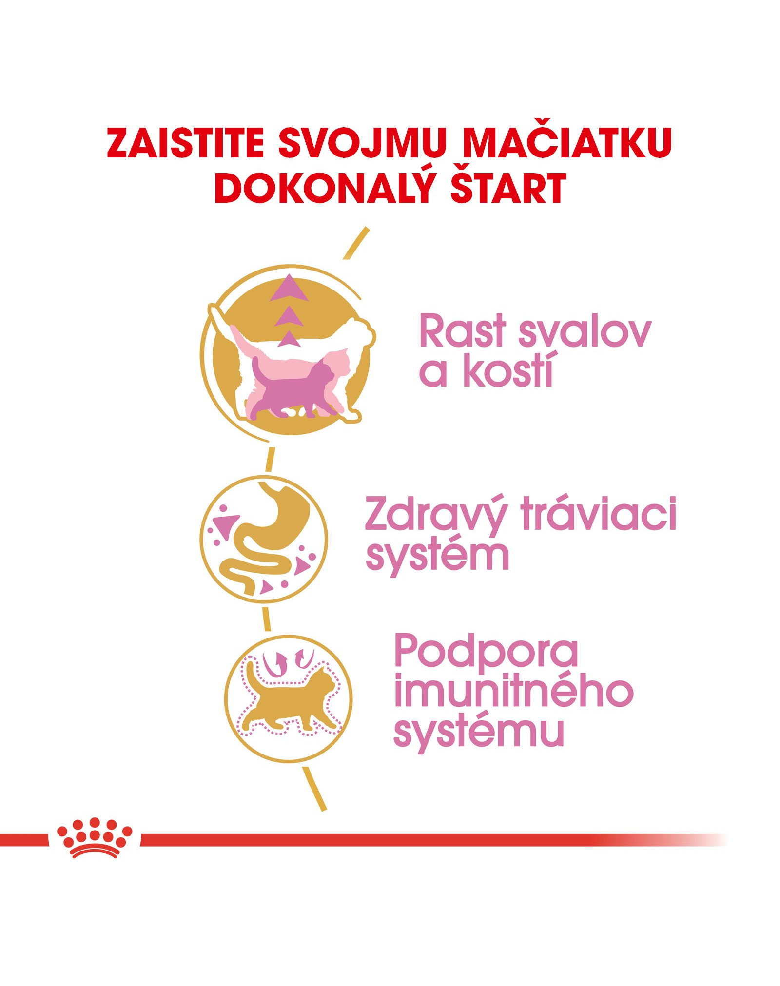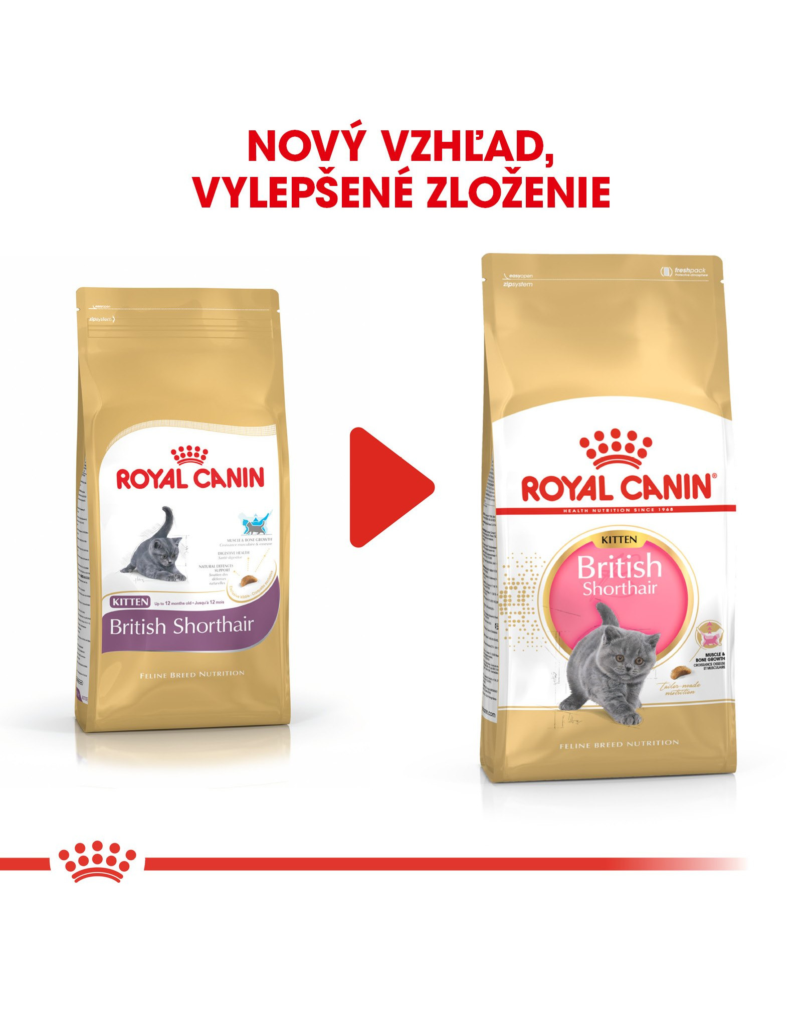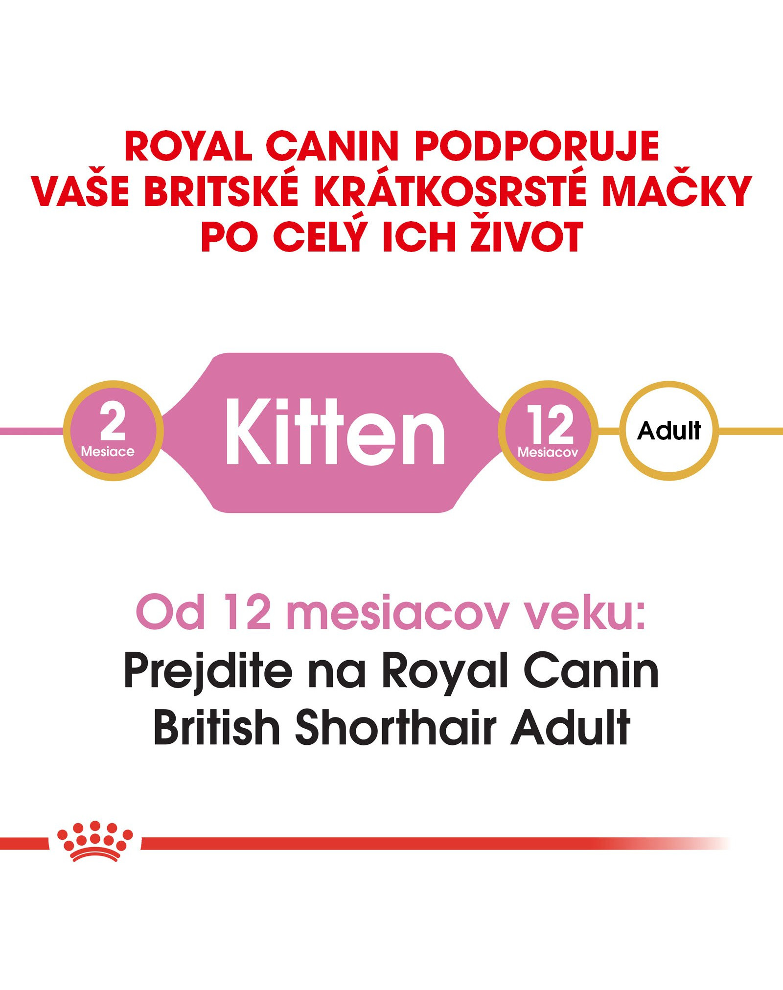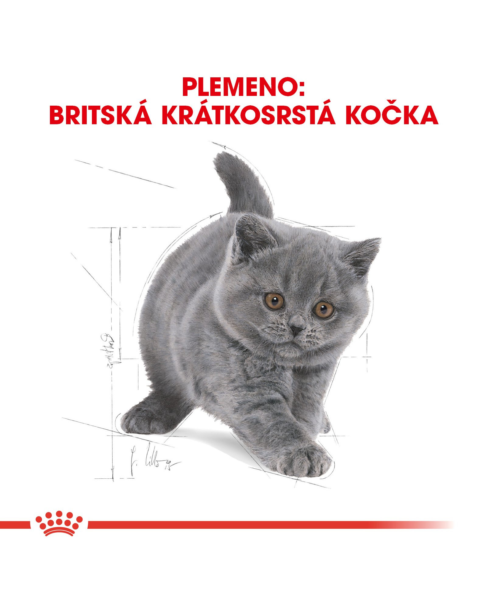 Royal Canin British Shorthair Kitten je kompletné superprémiové krmivo pre britské krátkosrsté mačiatka do 12 mesiacov.Aby mačiatko britskej krátkosrstej mačky vyrástlo do silnej krásavice, potrebuje v strave špeciálne upravený obsah bielkovín a vyvážený pomer minerálov a vitamínov. Krmivo British Shorthair Kitten obsahuje L.I.P., čo sú bielkoviny so stráviteľnosťou viac ako 90 %. Vďaka zvýšenému obsahu taurínu, L-karnitínu, EPA-DHA a antioxidantov navyše krmivo maximálne posilňuje funkciu srdcového svalu, pretože britské mačky majú predispozície k ochoreniu srdca. Tvar granuly „Moonstone 7“ podporí vývoj zdravo zaoblenej a silnej čeľuste.