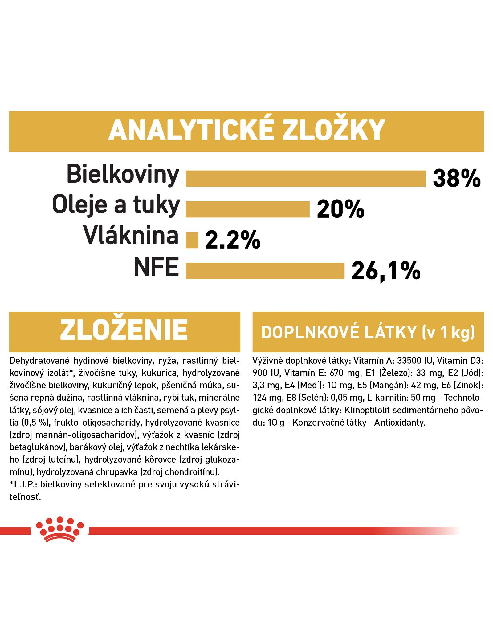 Zloženie: Dehydratované hydinové mäso, ryža, izolát rastlinného proteínu (L.I.P. - bielkovina pridávaná pre svoju ľahkú stráviteľnosť), živočíšne tuky, kukurica, pšeničná múka, hydrolyzované živočíšne proteíny, kukuričný lepok, repné odrezky, rastlinná vláknina, rybí olej, minerály, sójový olej, fruktooligosacharidy, šupky a semená psyllia (0,5 %), hydrolyzované kvasnice (zdroj mannánoligosacharidov), olej z boráka lekárskeho, výťažok z nechtíka lekárskeho (zdroj luteínu), hydrolyzované kôrovce (zdroj glukozamínu), hydrolyzované chrupavky (zdroj chondroitínu).