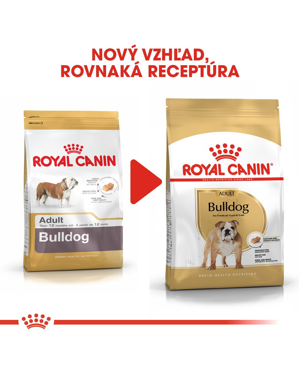 Granula krmiva ROYAL CANIN® Bulldog Adult je vytvorená na mieru tomuto plemenu. Ňufák týchto psov mieri nahor a hornú čeľusť majú kratšiu ako tú spodnú. Tvar a veľkosť tejto granuly bol upravený tak, aby sa vášmu psovi dobre uchopoval. Navyše jej textúra vedie k hryzeniu, aby buldog krmivo nehltal.