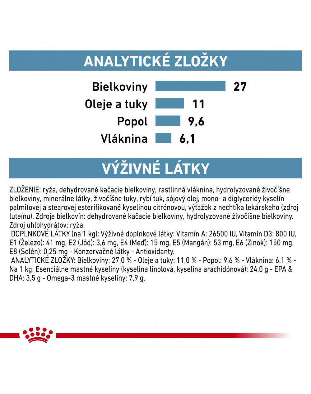A: 26500 IU, vitamín D3: 800 IU, E1 (železo): 41 mg, E2 (jód): 3,6 mg, E4 (meď):