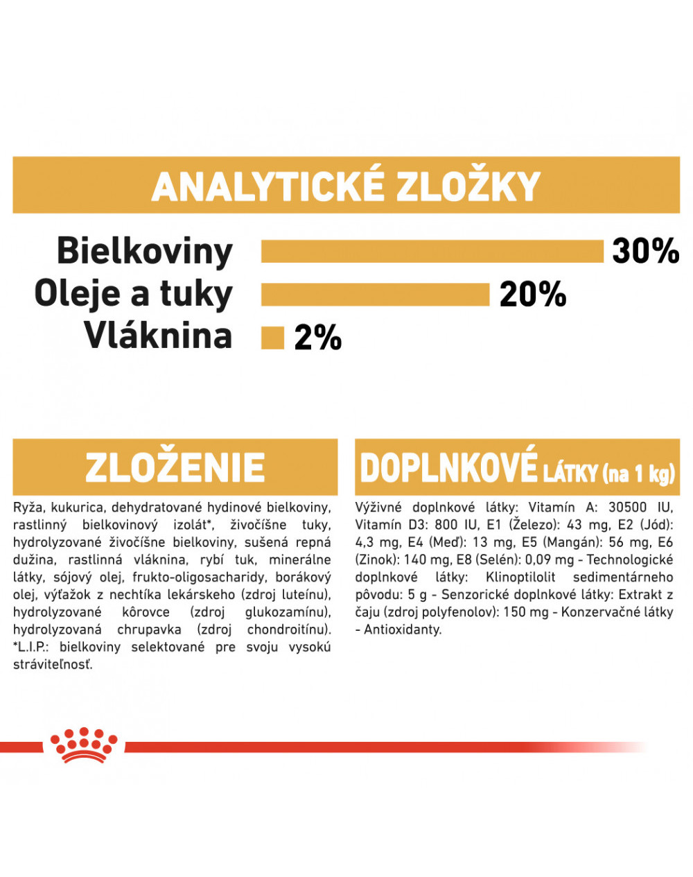 Zloženie: Ryža, kukurica, dehydratované hydinové mäso, izolát rastlinného proteínu (L.I.P. – proteín vybraný vďaka svojej vysokej stráviteľnosti), živočíšne tuky, hydrolyzované živočíšne proteíny, repné odrezky, rastlinná vláknina, minerály, rybí olej, sójový olej, fruktooligosacharidy, olej z boráka lekárskeho, výťažok z nechtíka lekárskeho (zdroj luteínu, výťažky zo zeleného čaju a viniča hroznorodého (zdroj polyfenolov), hydrolyzované kôrovce (zdroj glukozamín), hydrolyzované chrupavky (zdroj chondroitínu).