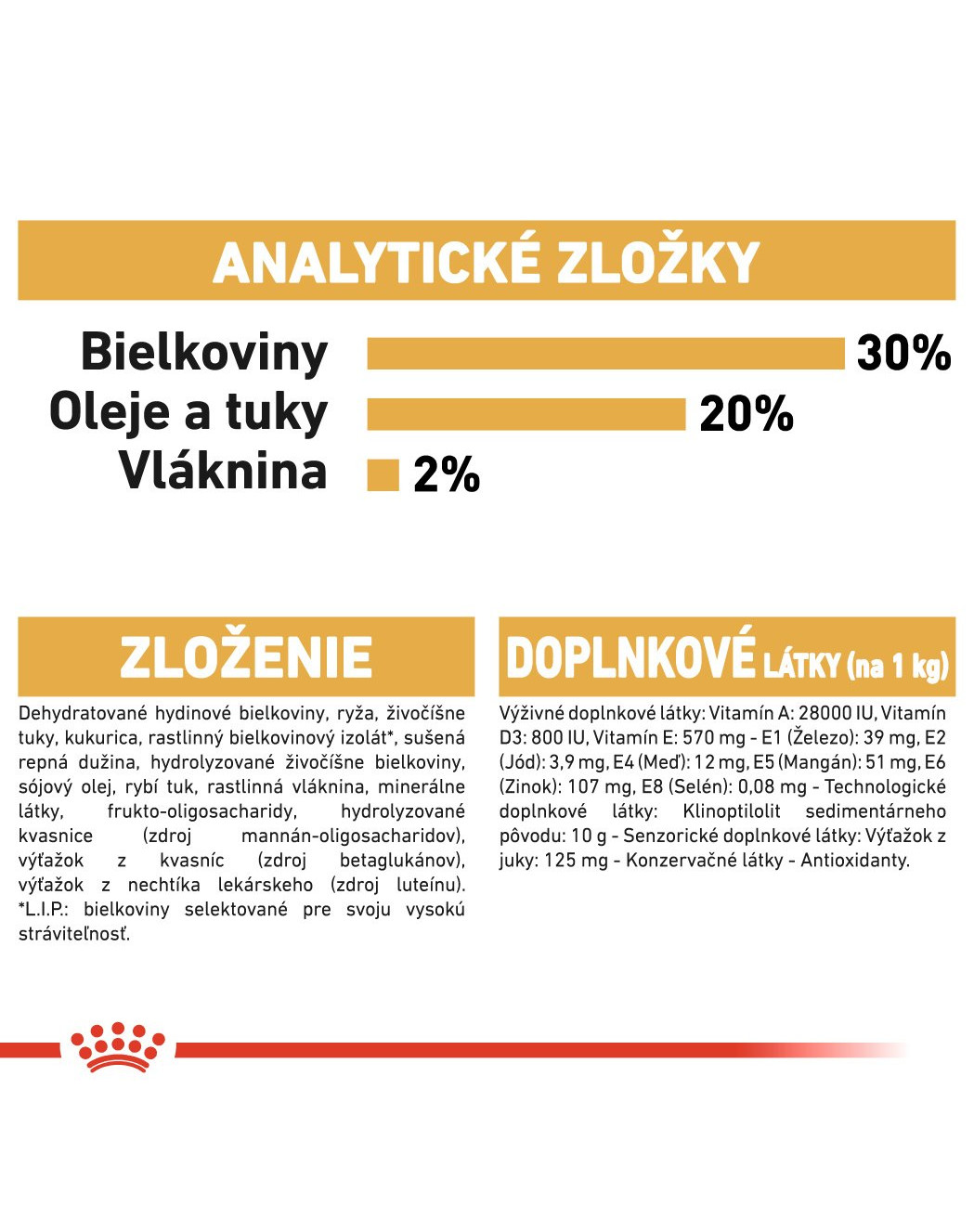 Zloženie: Dehydratované hydinové mäso, ryža, živočíšne tuky, kukurica, izolát rastlinného proteínu (L.I.P. – proteín vybraný vďaka svojej vysokej stráviteľnosti), repné odrezky, hydrolyzované živočíšne proteíny, sójový olej, rybí olej, rastlinná vláknina, minerály, fruktooligosacharidy, hydrolyzované kvasnice (zdroj mannánoligosacharidov), výťažky z kvasníc (zdroj betaglukánu), výťažok z nechtíka lekárskeho (zdroj luteínu).