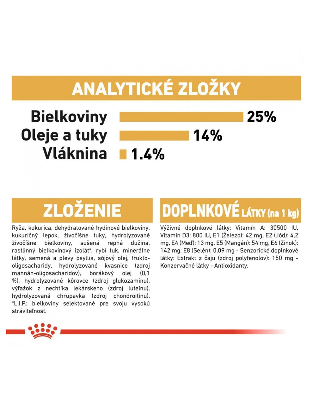 Zloženie:Ryža, kukurica, dehydratované hydinové mäso, kukuričný lepok, živočíšne tuky, hydrolyzované živočíšne proteíny, repné odrezky, izolát rastlinného proteínu (L.I.P. – proteín vybraný vďaka svojej vysokej stráviteľnosti), rybí olej, minerály, šupky a semená psyllia, sójový olej, fruktooligosacharidy, hydrolyzované kvasnice (zdroj mannánoligosacharidov), olej z boráka lekárskeho (0,1 %), hydrolyzované kôrovce (zdroj glukozamínu), výťažok z nechtíka lekárskeho (zdroj luteínu), hydrolyzované chrupavky (zdroj chondroitínu).