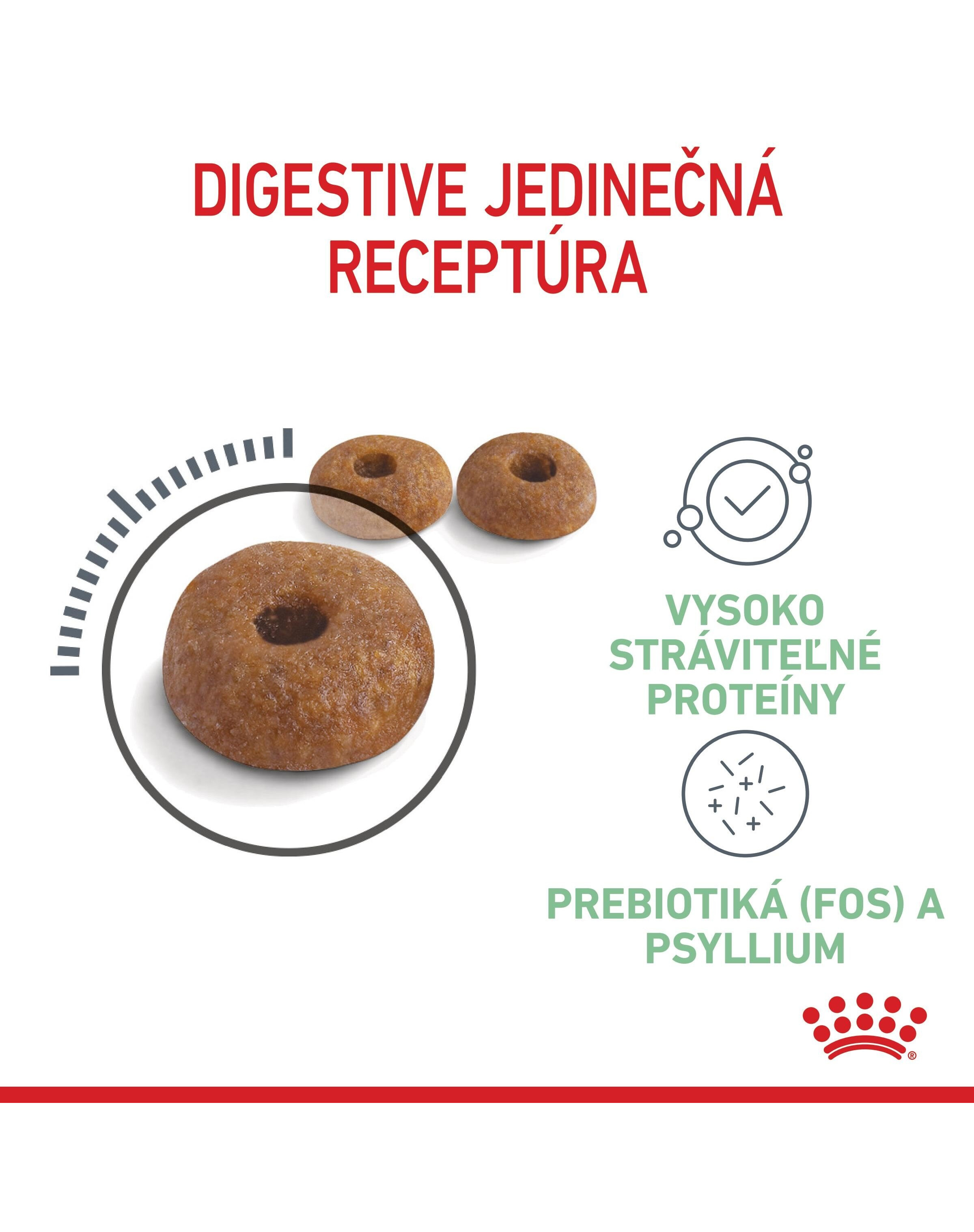 ROYAL CANIN Digestive Care je nutrične kompletné a vyvážené zloženie špeciálne navrhnuté na podporu zdravého trávenia. Vďaka zahrnutiu vysoko stráviteľných bielkovín (L.I.P.) a zmesi prebiotík a vlákniny (vrátane psyllia) pomáha táto receptúra podporovať zdravú kvalitu stolice. Táto diéta je tiež zostavená s vyváženým pomerom minerálov, ktoré pomáhajú udržiavať zdravie močového systému vašej dospelej mačky. ROYAL CANIN Digestive Care má preukázané výsledky. Naša štúdia* ukázala, že táto diéta pomohla zúčastneným mačkám dosiahnuť u viac ako 95% zdravej kvality stolice za pouhých 10 dní.