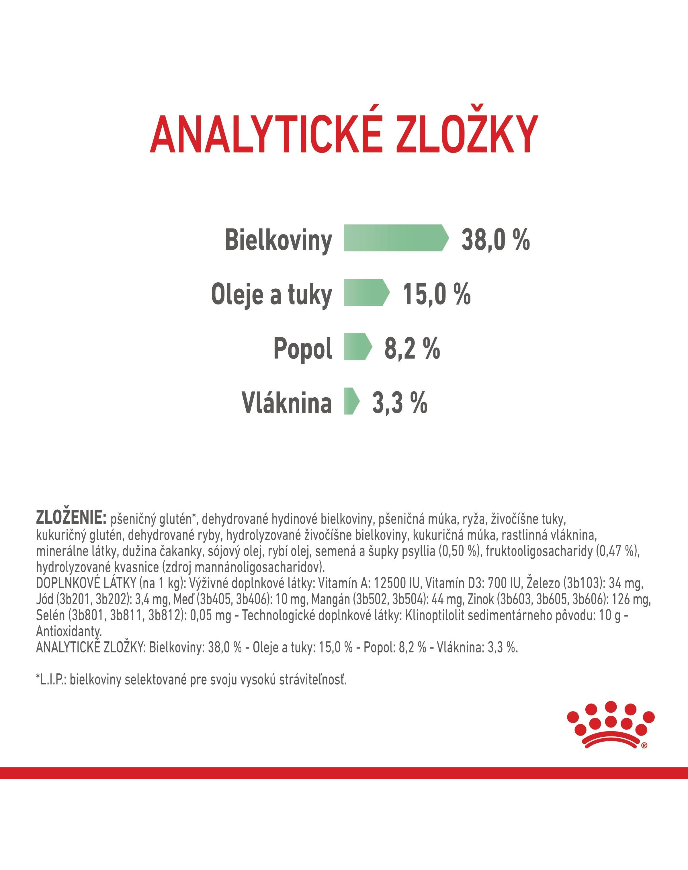 Zloženie: rastlinný bielkovinový izolát*, pšeničná múka, dehydratované ryby, ryža, živočíšne tuky, dehydratované hydinové bielkoviny, hydrolyzované živočíšne bielkoviny, kukuričný lepok, kukuričná múka, rastlinná vláknina, dužina čakanky, minerálne látky, sójový olej, rybí tuk, frukto-oligosacharidy (0,3%), semená a plevy psyllia (0,2 %).