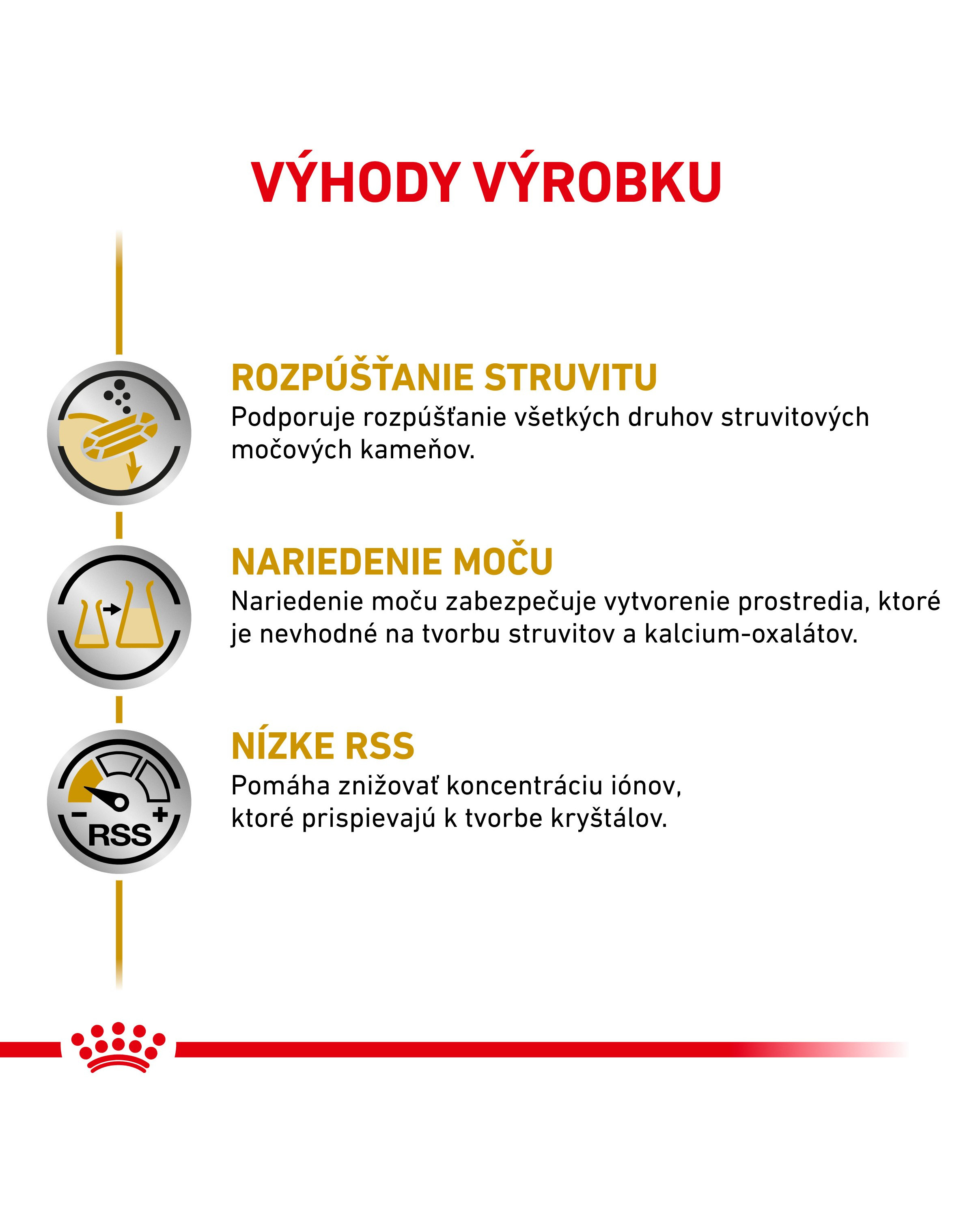 Kompletné diétne vlhké krmivo pre mačky. Obsah látok podporujúcich kyslosť moču a nízky obsah horčíka ju robí vhodnou pre rozpúšťanie struvitových kameňov a pre zníženie rizika ich opätovného výskytu. Jej zloženie tiež napomáha pri liečbe ochorení dolných močových ciest.
